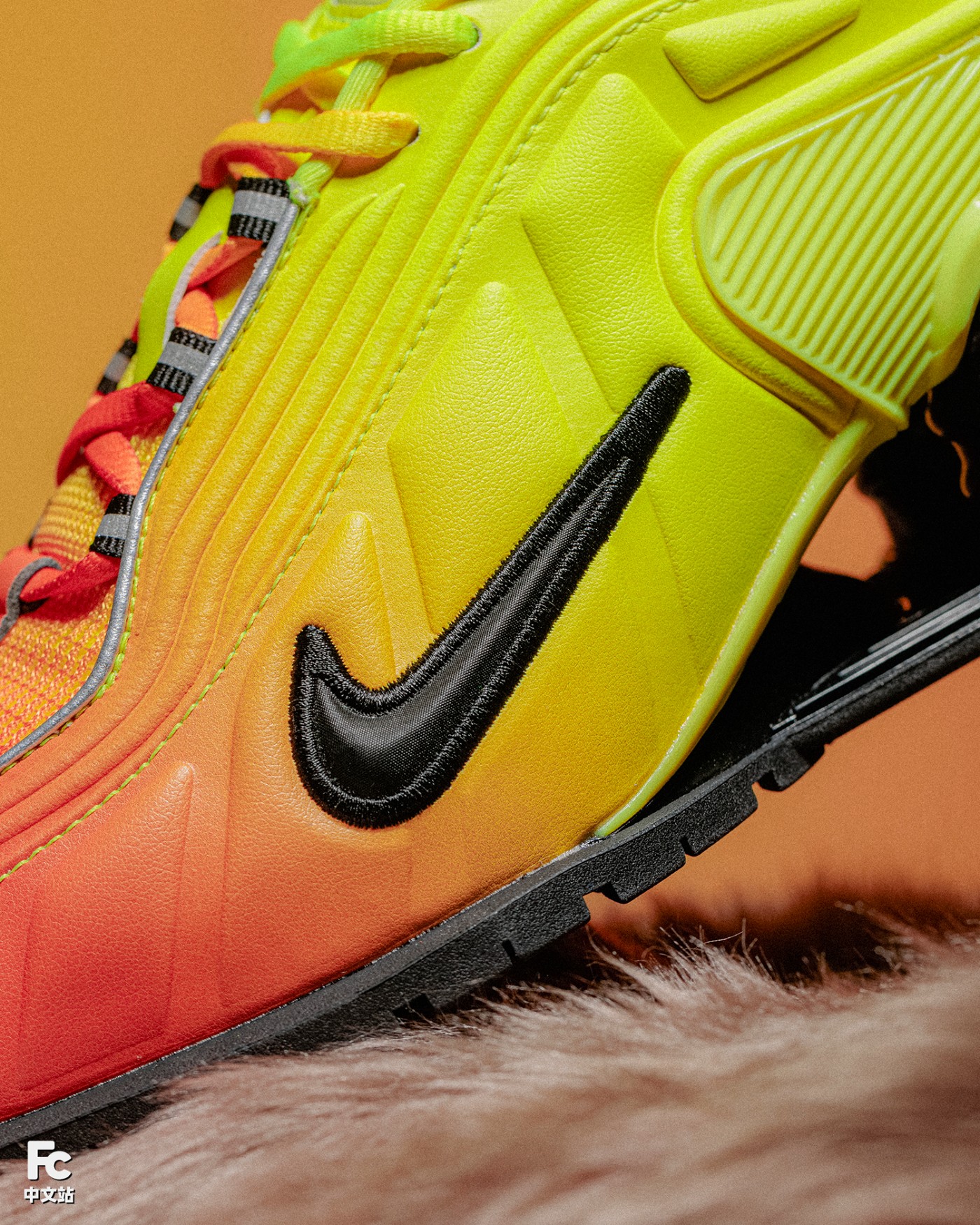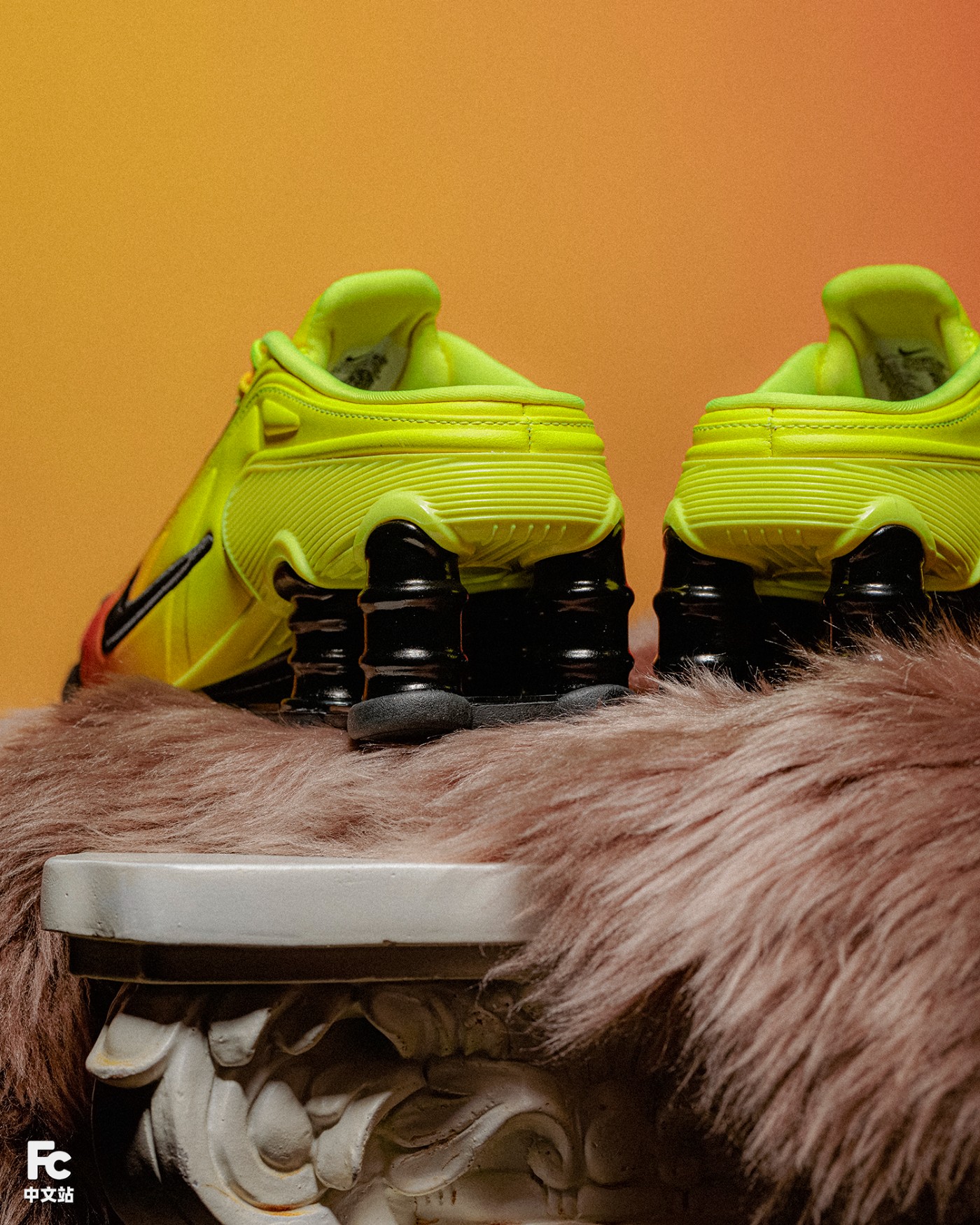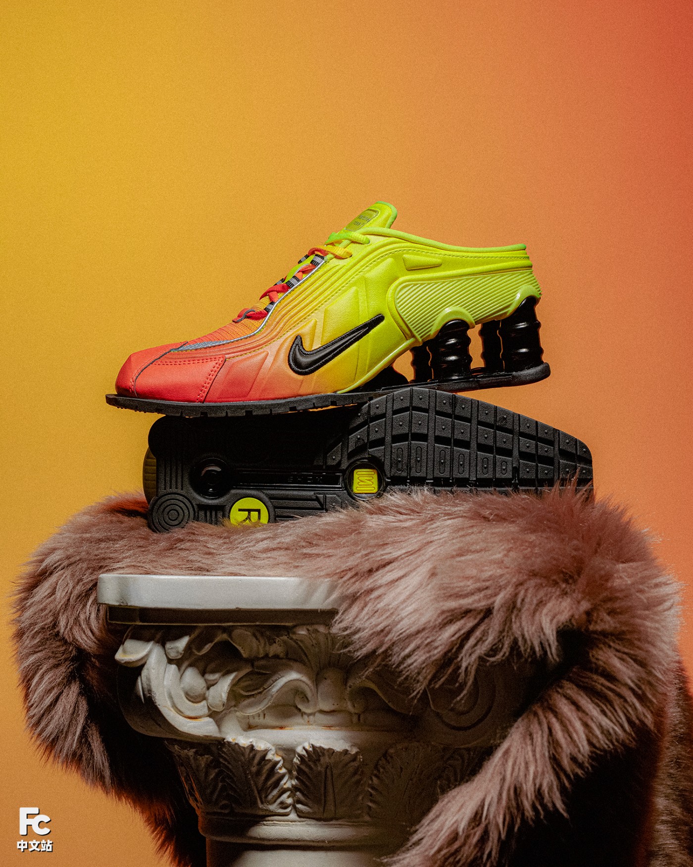 相较于首发的黑红以及纯白两款配色,全新配色的 Martine Rose x Nike Shox MR4 采用渐变配色呈现鞋身。