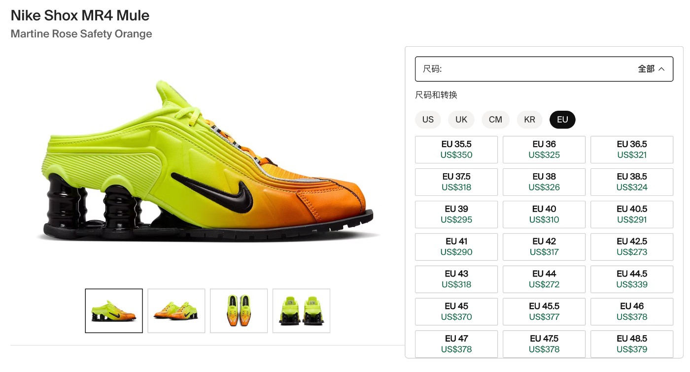 唯一遗憾的是,此次全新配色 Martine Rose x Nike Shox MR4 尺码仅包含 35.5 - 42,男鞋头无缘了。