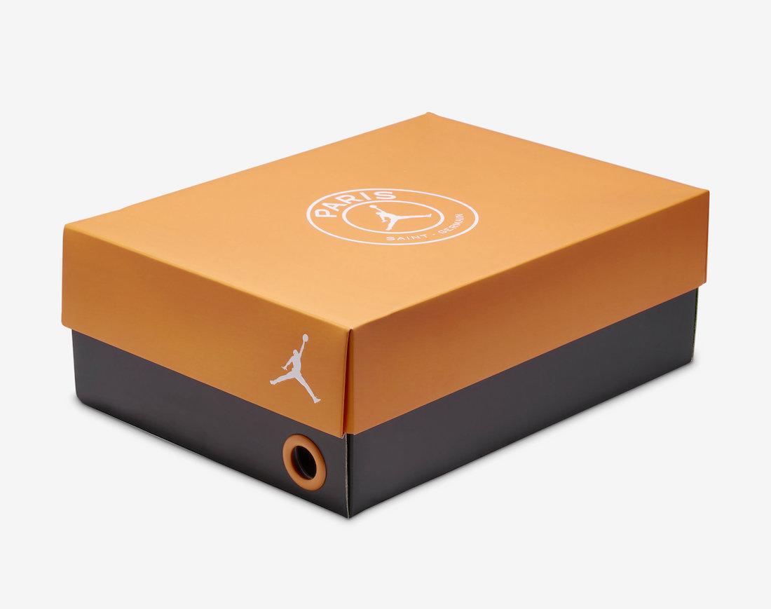 鞋盒造型也是同样亮眼,选择橘色和水泥灰色组成,并在正上方印有「大巴黎 AJ」的 Logo,可见诚意。