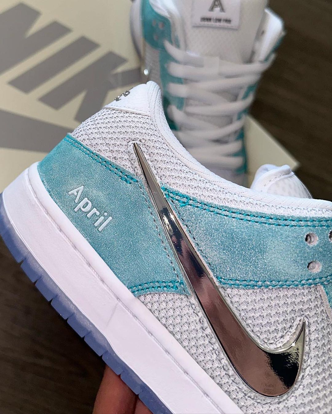 细节方面,不仅将侧身 Swoosh 以电镀银色示人,还在鞋身外侧、鞋舌及后跟点缀有「April Skateboards」专属 Logo,彰显联名身份。
