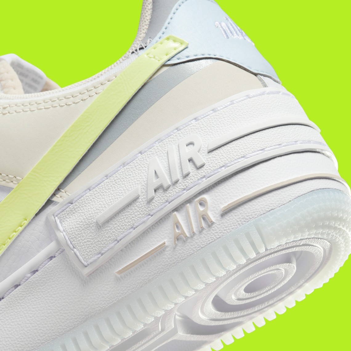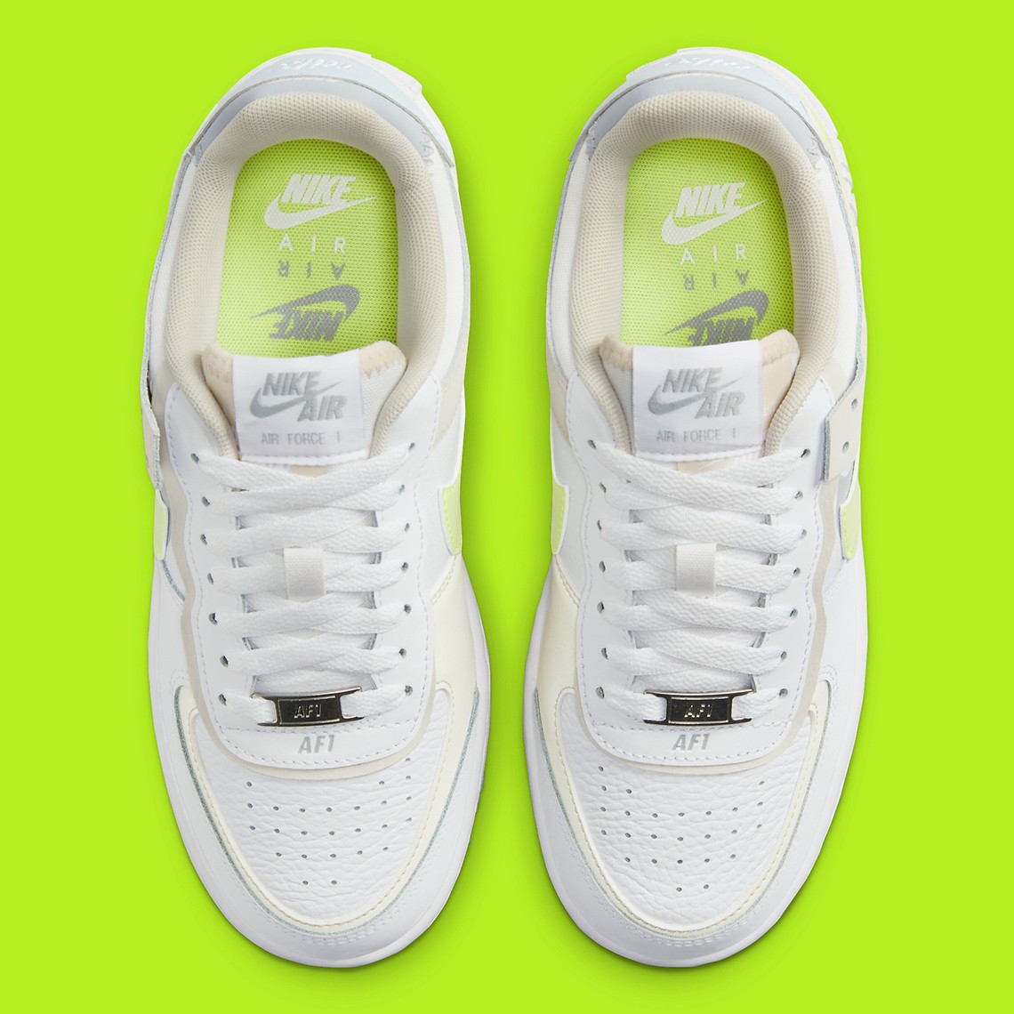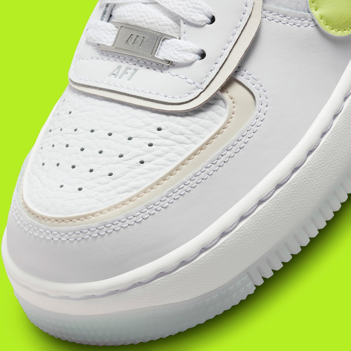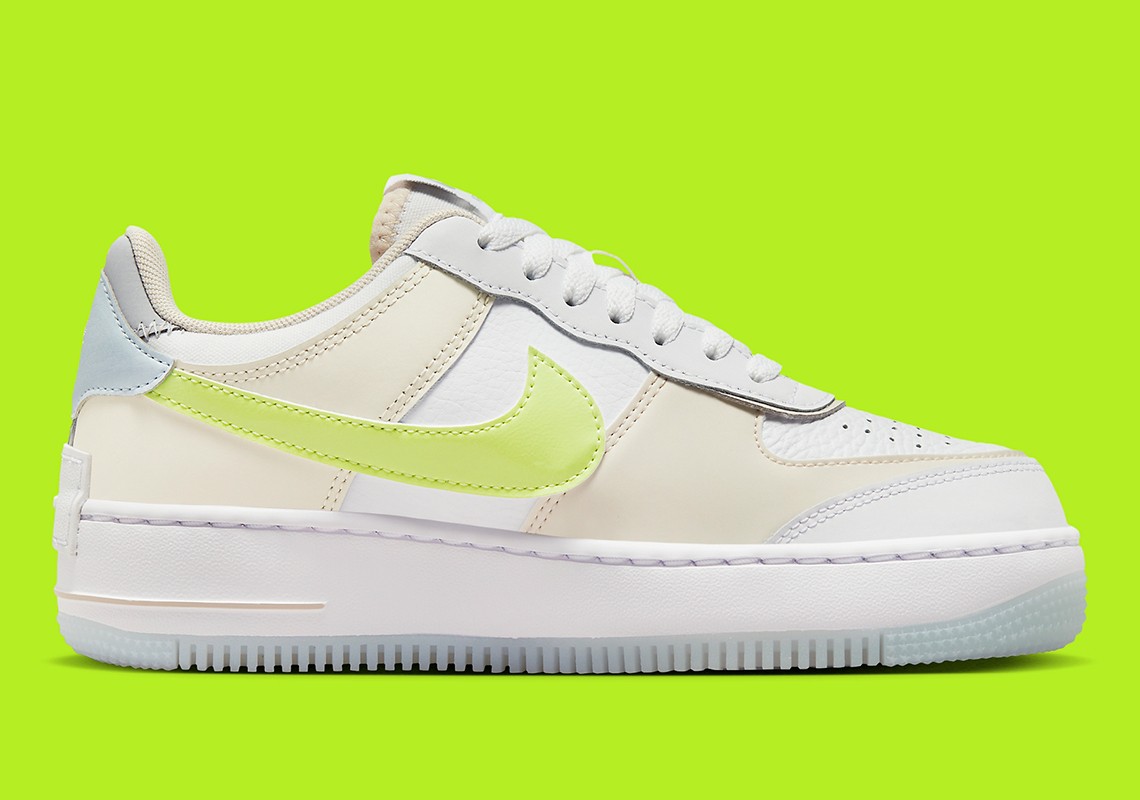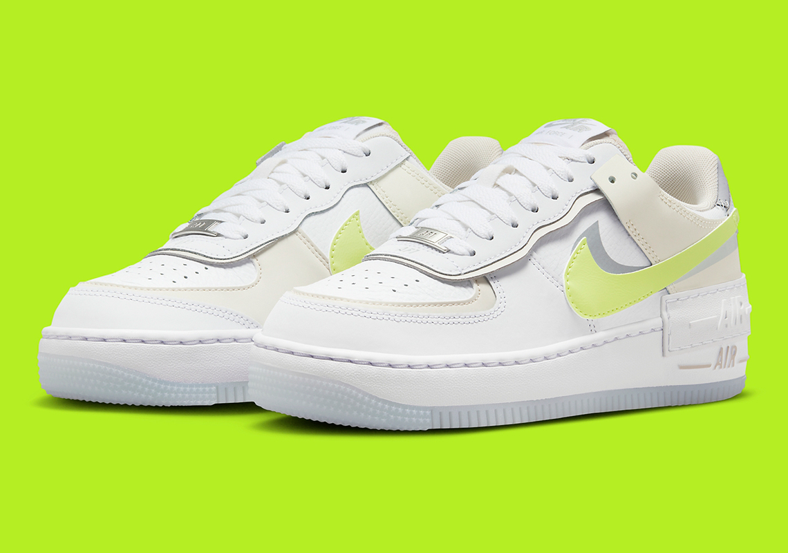 整双鞋以白色为主调,辅以米白、灰色以及荧光黄点缀,视觉效果格外醒目。