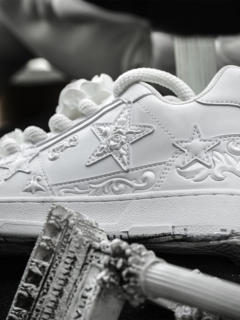 鞋身采用黑、白色皮革材质为底,使浮雕肌理部分更加凸显,仿佛真实的浮雕艺术品。