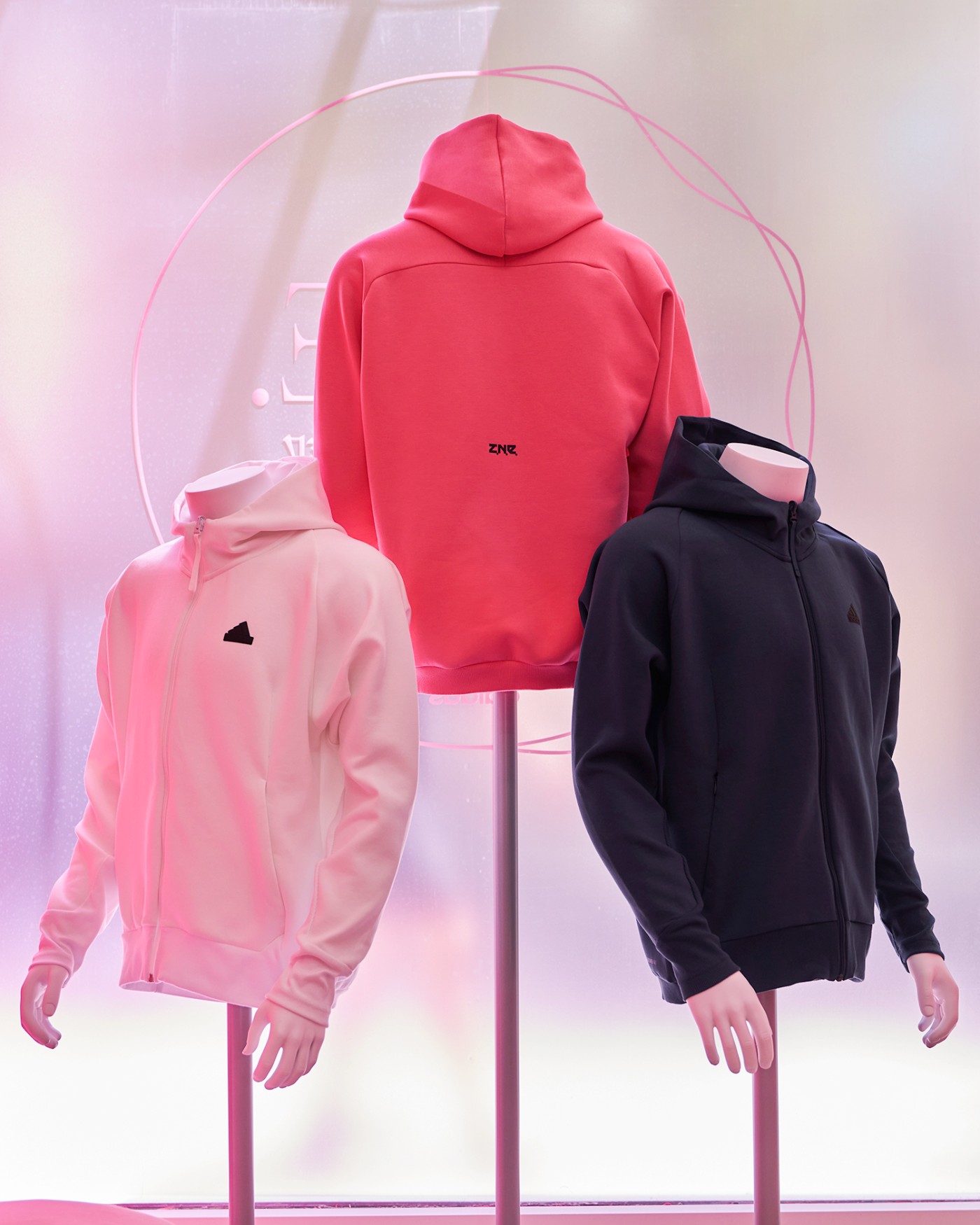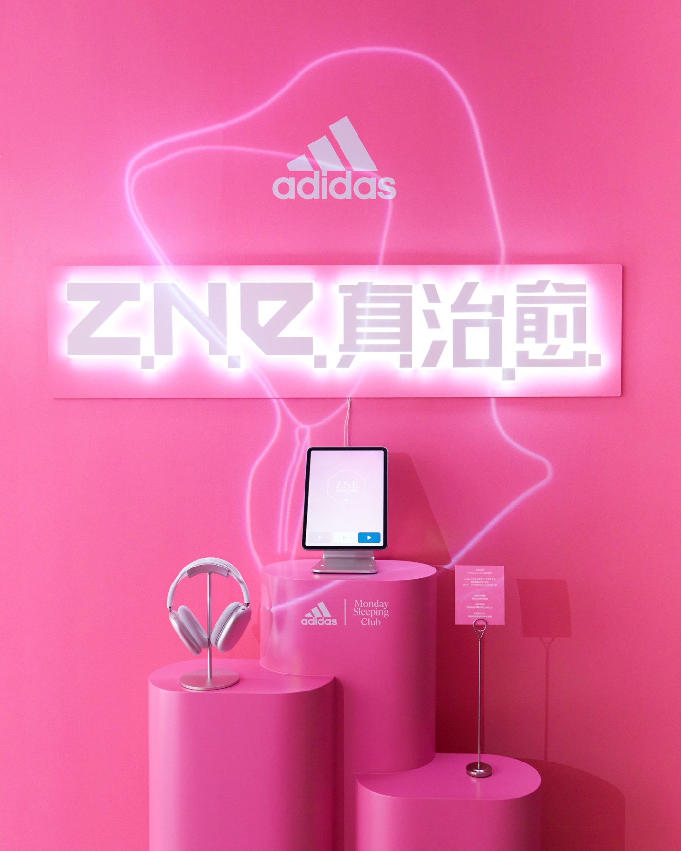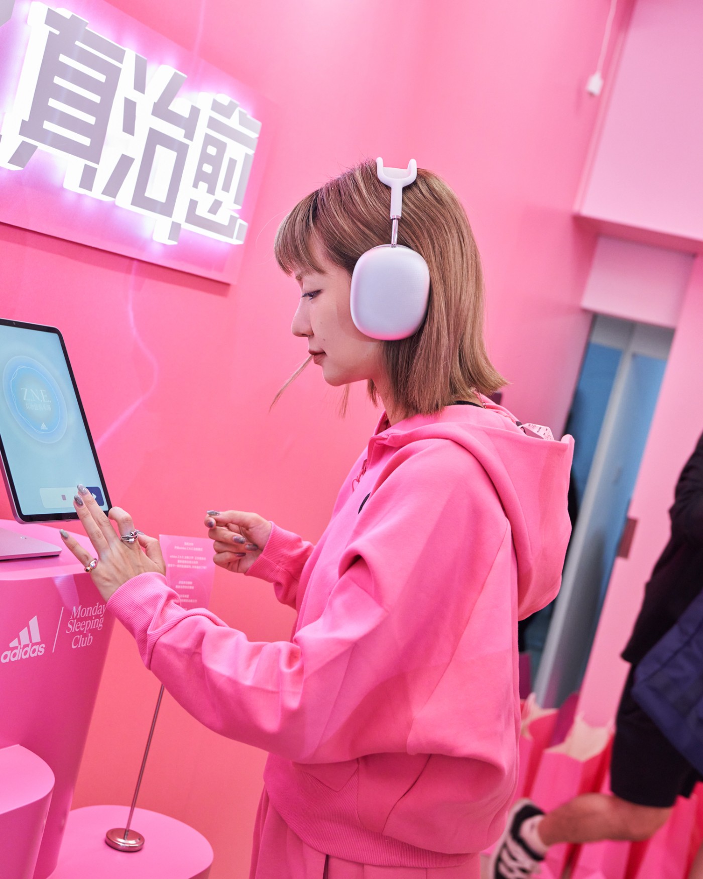 现场以粉色多巴胺氛围包裹,从视觉、听觉、触觉以及嗅觉多种感官,诠释 adidas Sportswear Z.N.E. 系列的治愈主题。