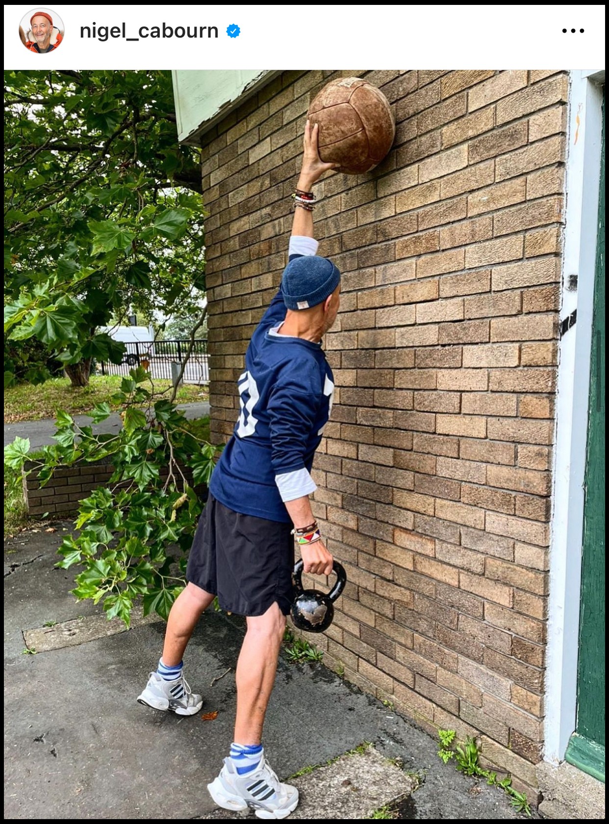 除此之外,近日小编发现被称为复古工装 “活字典” 的英国服装设计师 Nigel Cabourn,在日常健身中上脚了一双全新白蓝配色。