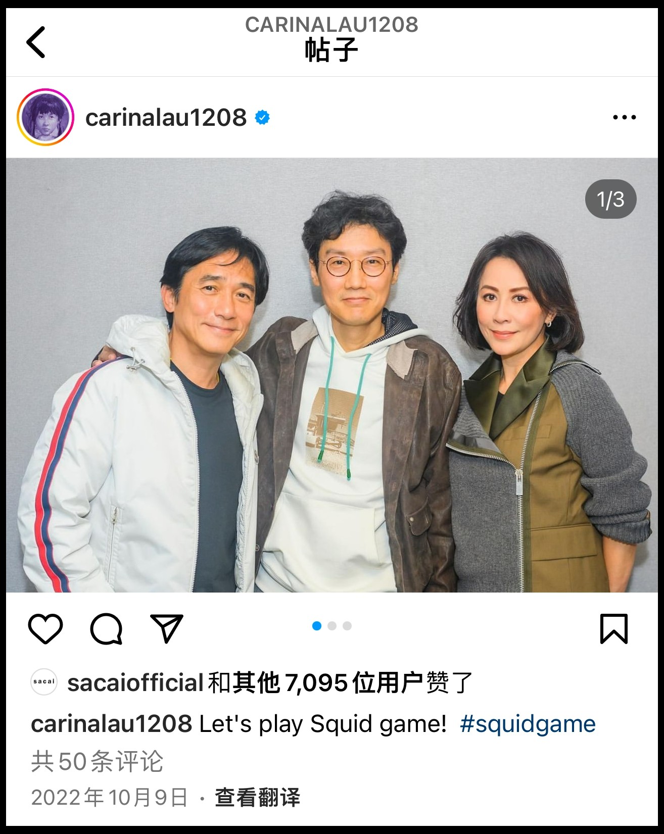 此前刘嘉玲在社交平台接连晒出梁朝伟碰面鱿鱼游戏导演黄东赫。