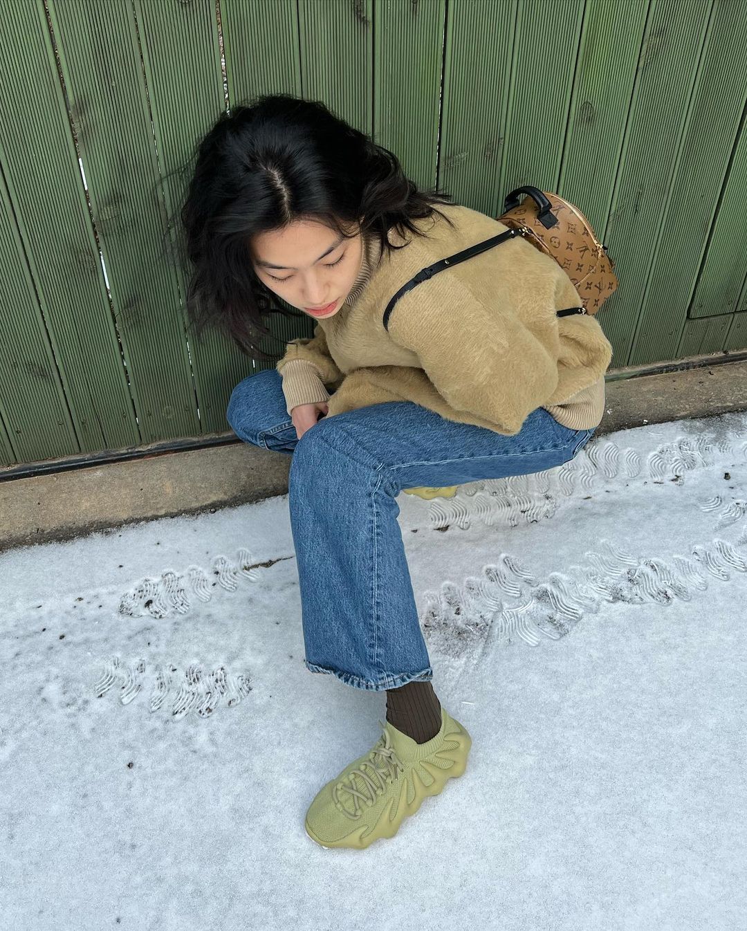 NewJeans 则是全员 Timberland「大黄靴」搭配腿套的造型。
