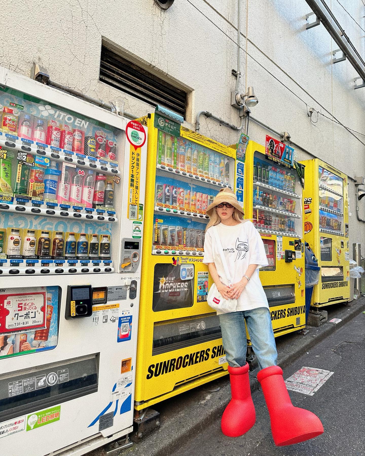 在最近日本的街拍中,上脚了最近大火的大红靴,作为女鞋头可以说是紧跟时事了,再背上 Supreme 斜挎包,短袖 T 恤搭配牛仔裤,真的不要太帅。