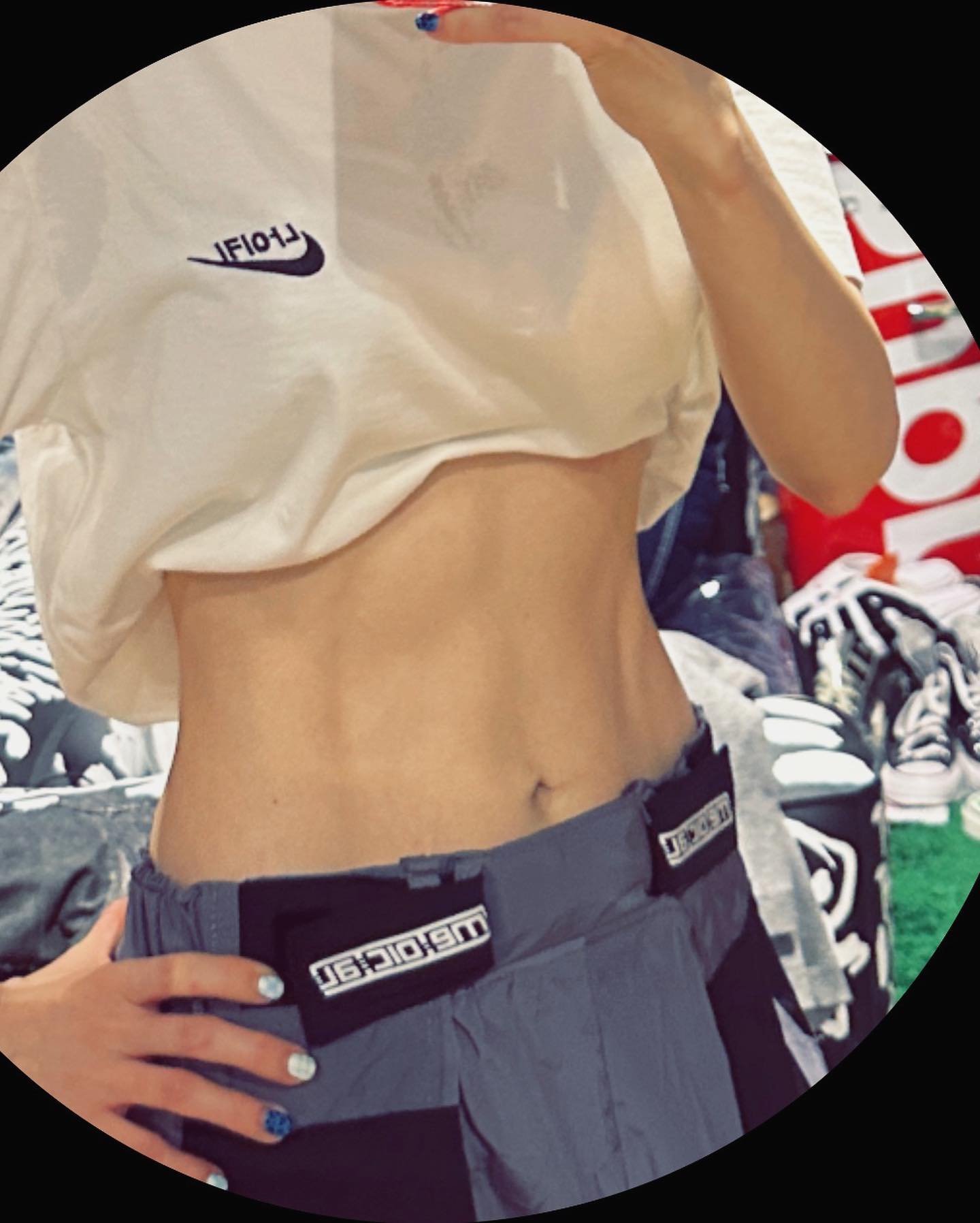 除了鞋,我们的朴山多拉还在镜中展示自己的腹肌,大秀好身材。