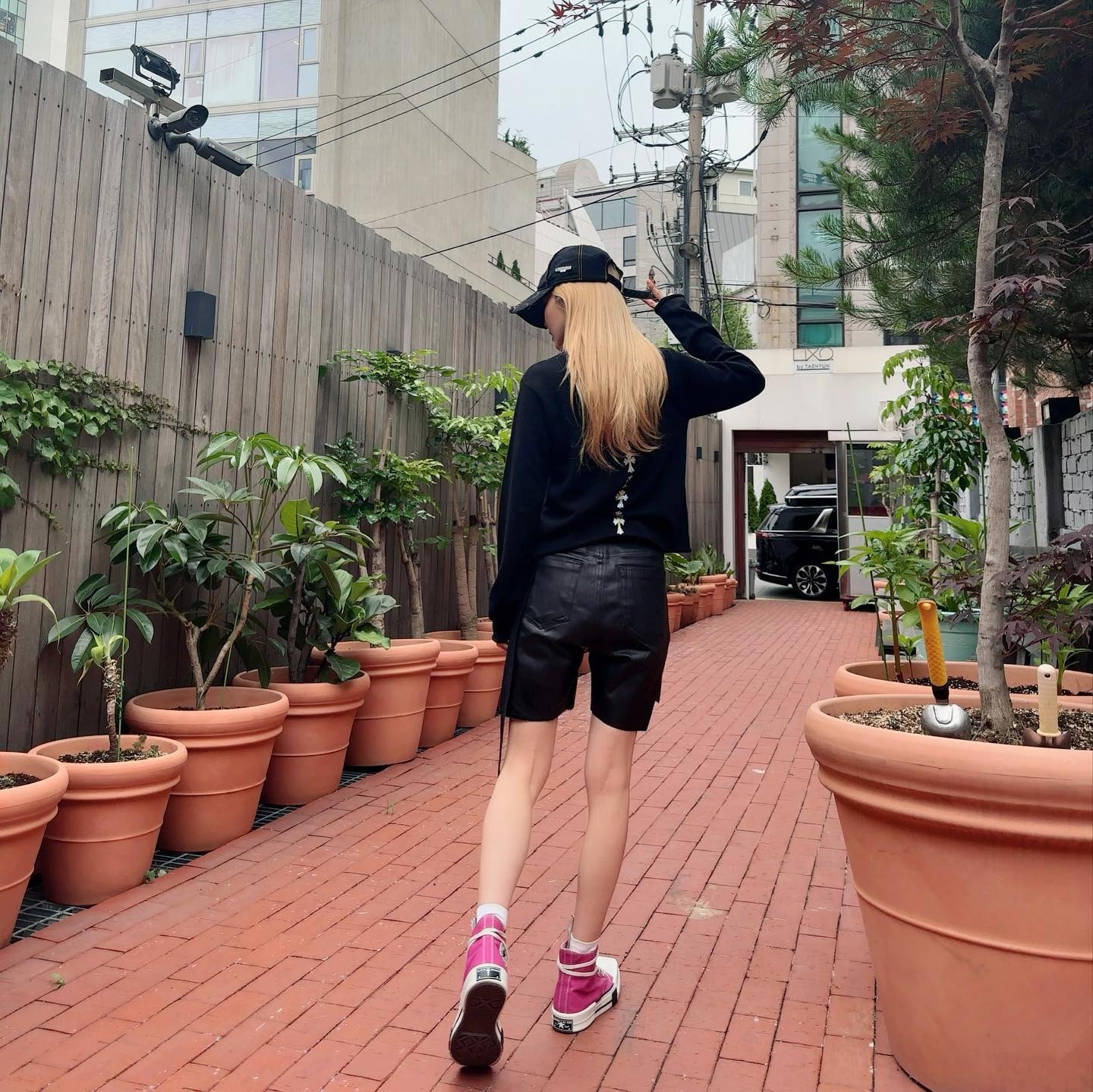 除此之外脚上穿的是 Dr. Martens 马丁靴,不管是穿短裤还是长裤都能够显腿长。