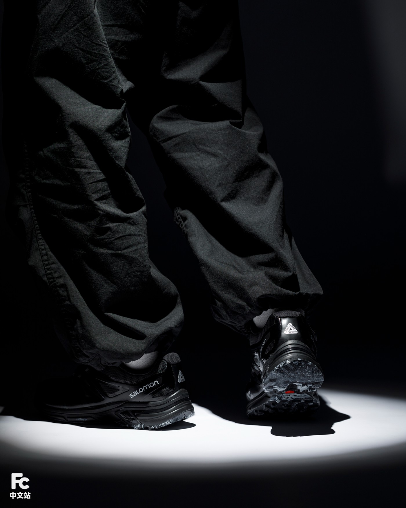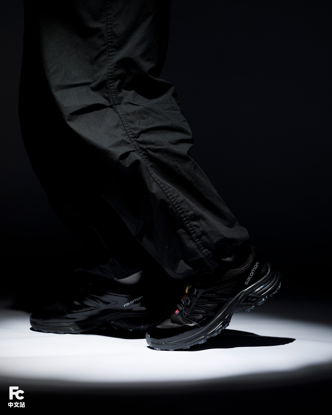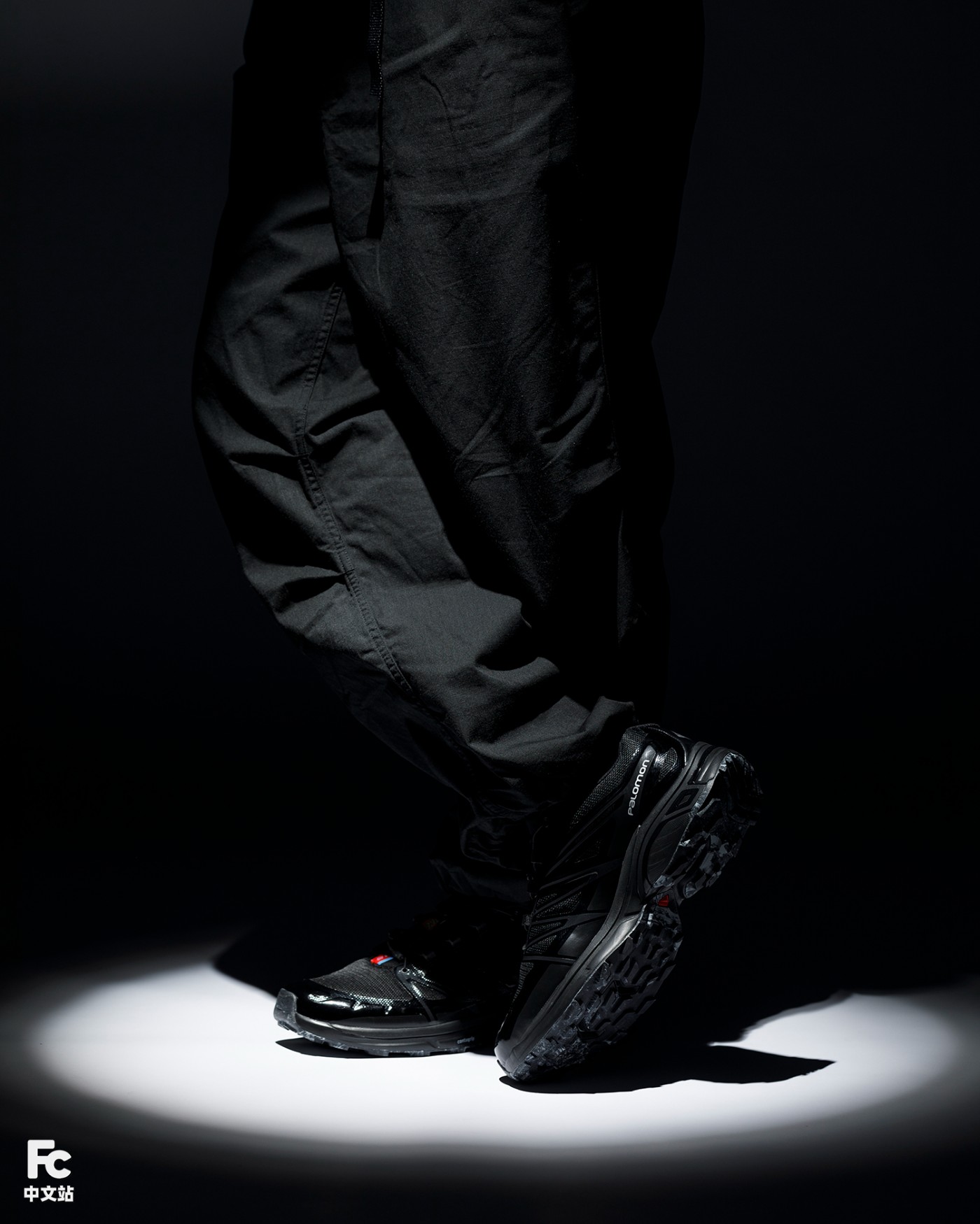 黑色的鞋身加上 Salomon 自带的机能气质,小编直接选择了一条黑色束脚伞兵裤进行搭配,低调奢华,又不失潮流气质。