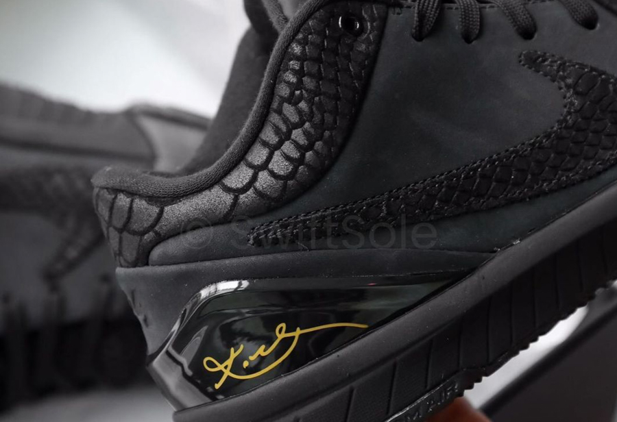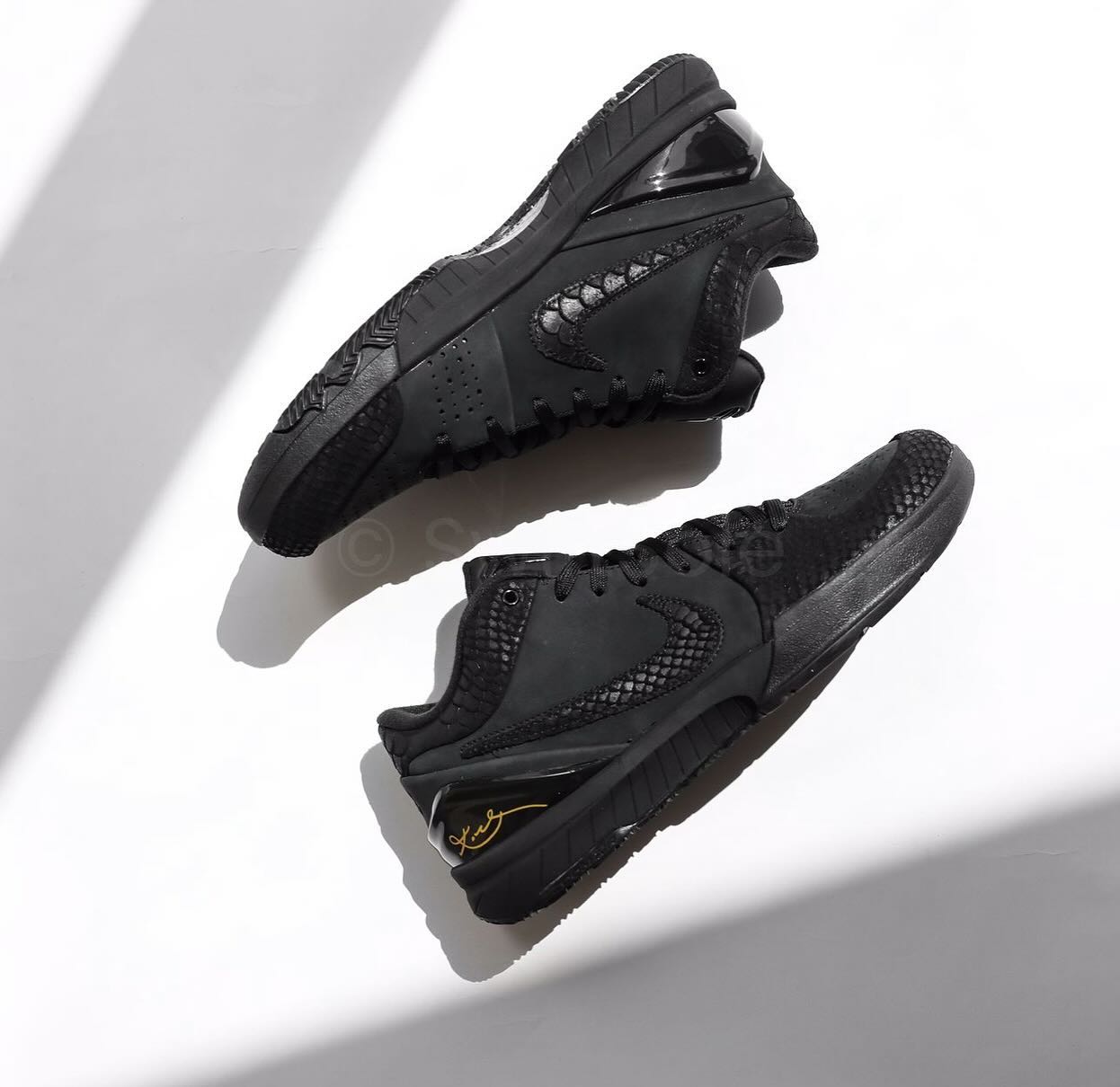 首先鞋身一改 Kobe 4 “塑料鞋面” 的固有印象,采用黑色麂皮与蛇纹共同构建,鞋舌 Kobe Logo 采用亮黑点缀,后跟 TPU 稳定片注入金色科比签名,营造黑曼巴的犀利气氛。
