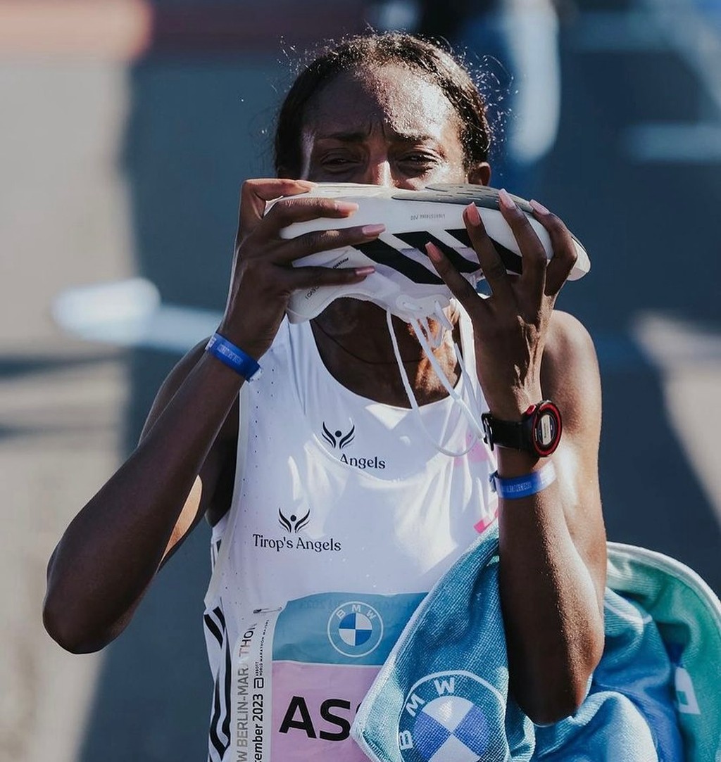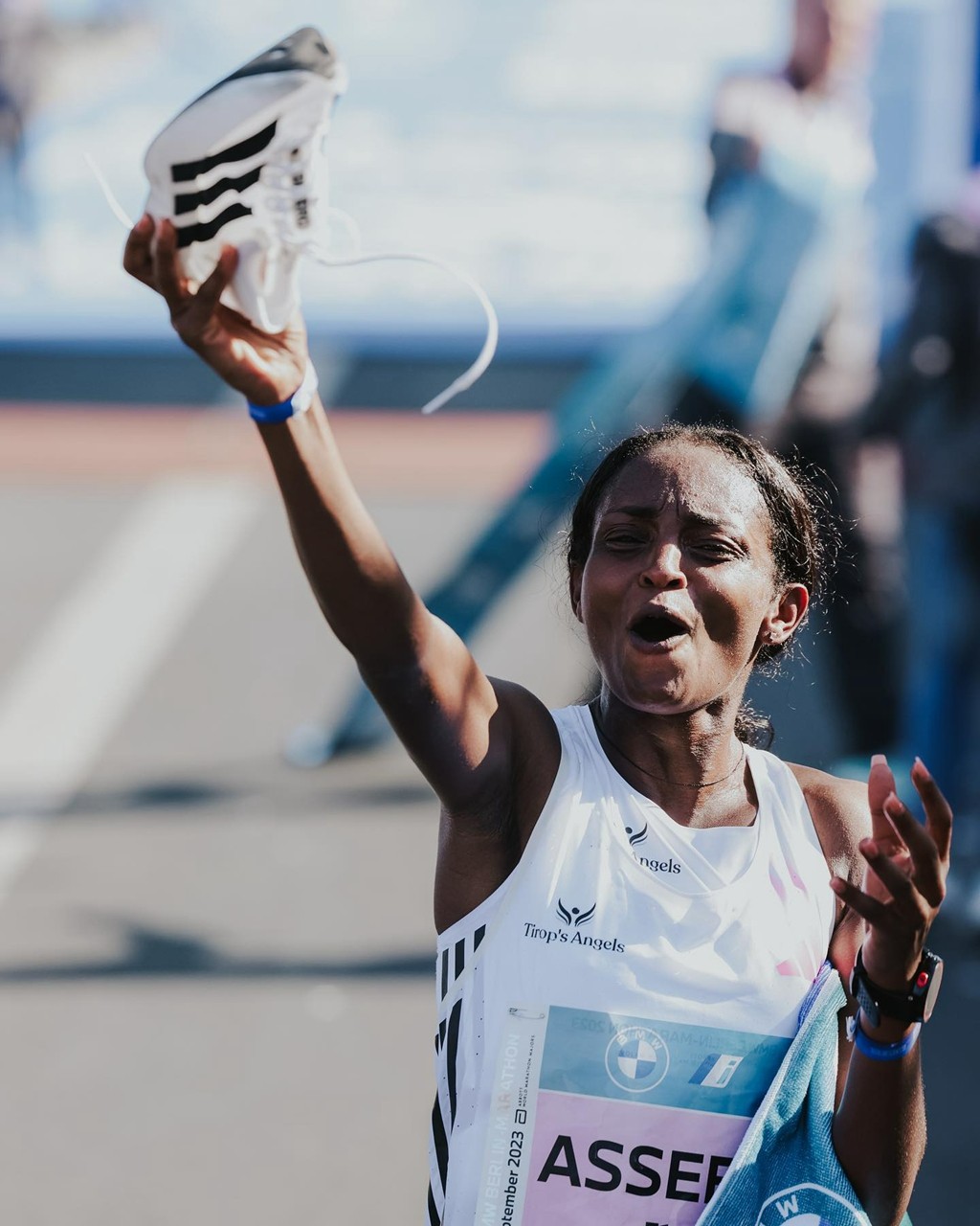 最值得一提的当然是上届卫冕冠军 Tigist Assefa,昨天以 2 小时 11 分 53 秒的成绩夺冠,并且将原有世界纪录提高整整 2 分 11 秒!