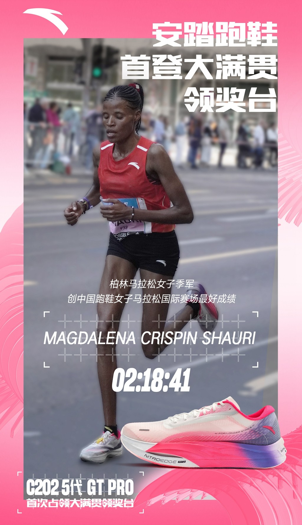 这也是安踏首次登上马拉松大满贯赛事领奖台,创造了历史。