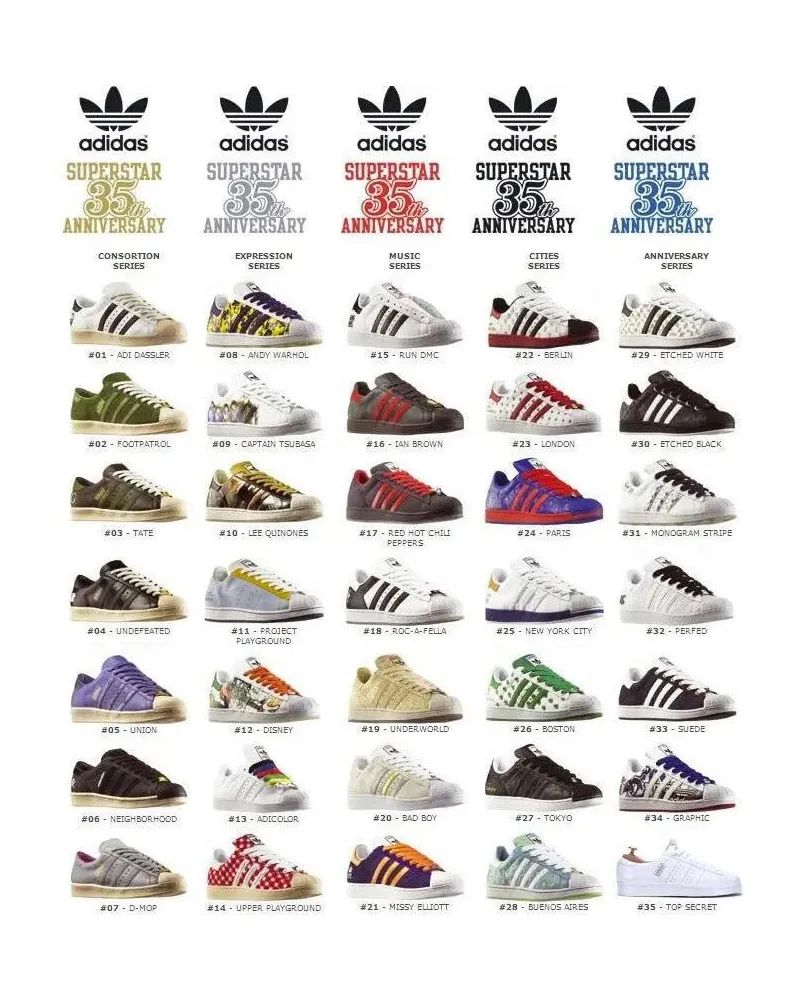 2005 年 adidas Originals 带来了五大系列,共 35 款设计,缔造了不少经典联名,分别是:联营系列、周年系列、音乐系列、表现系列、城市系列。
