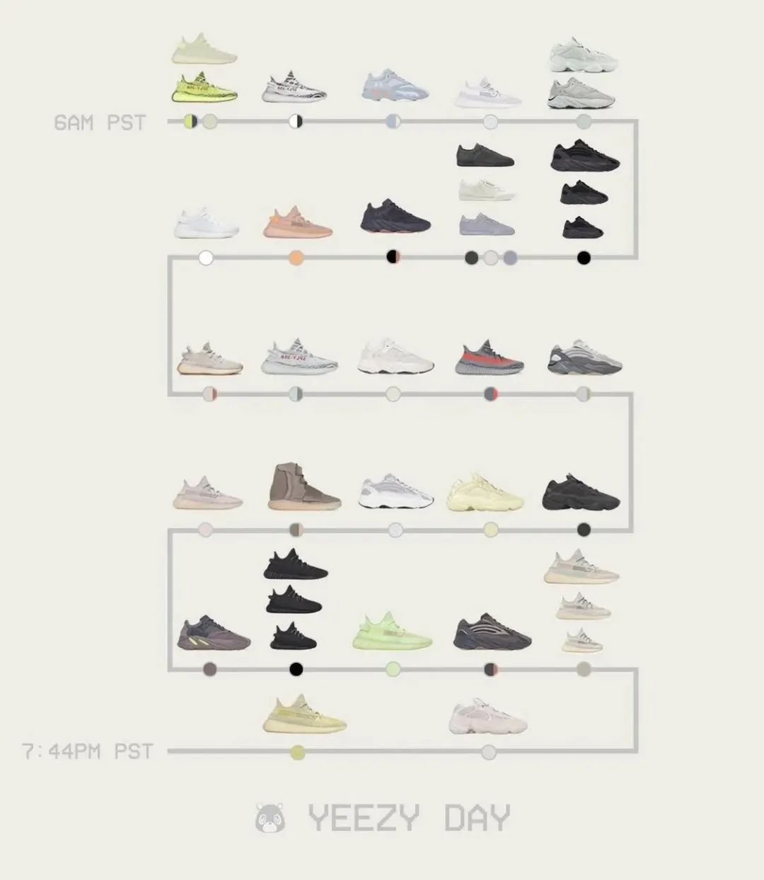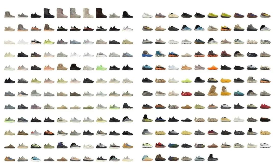 前段时间,海外玩家曾统计过侃爷任职 adidas 时期所打造的所有 Yeezy 系列鞋款及配色。