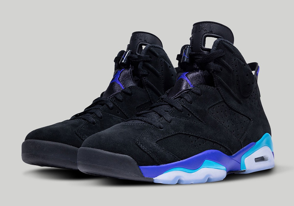 作为 Air Jordan 系列中最经典的配色之一,此次将其用在 Air Jordan 6 上,黑色麂皮加上深浅蓝色的中底和 Aqua 标志性元素,辨识度稳稳拿捏。