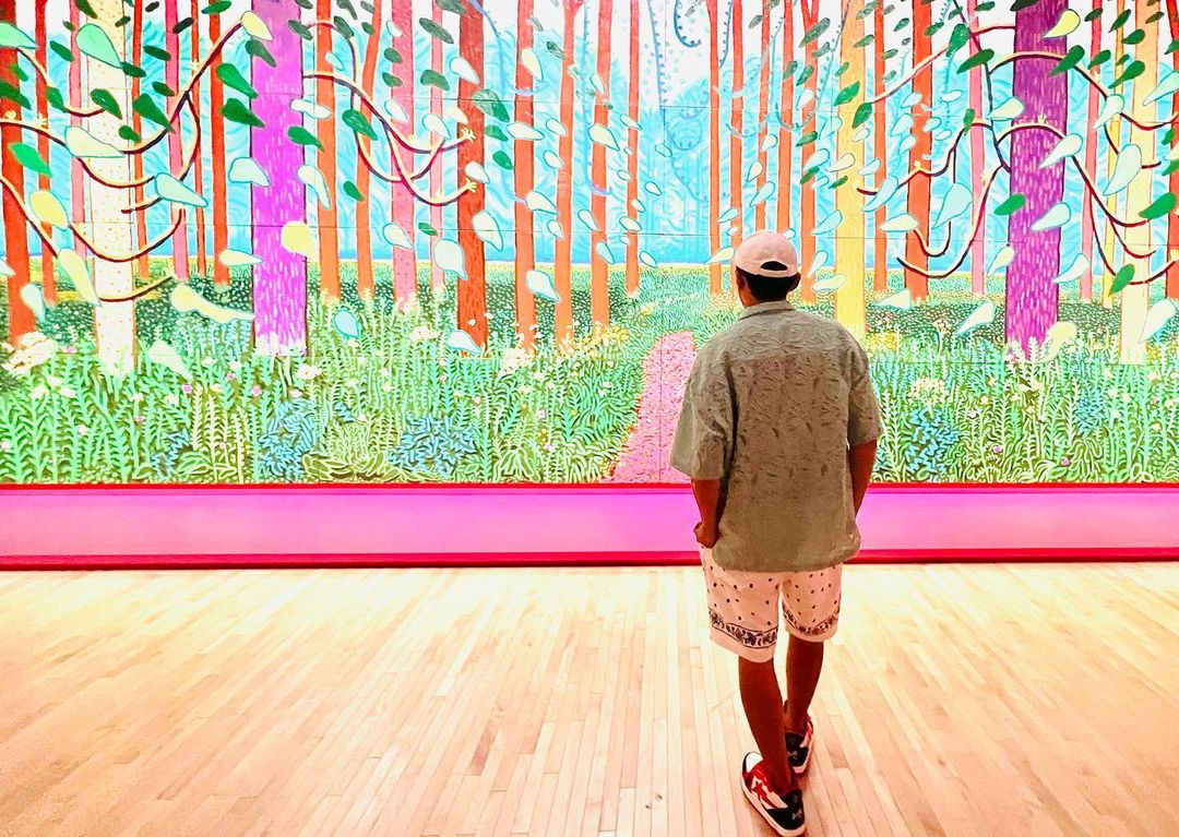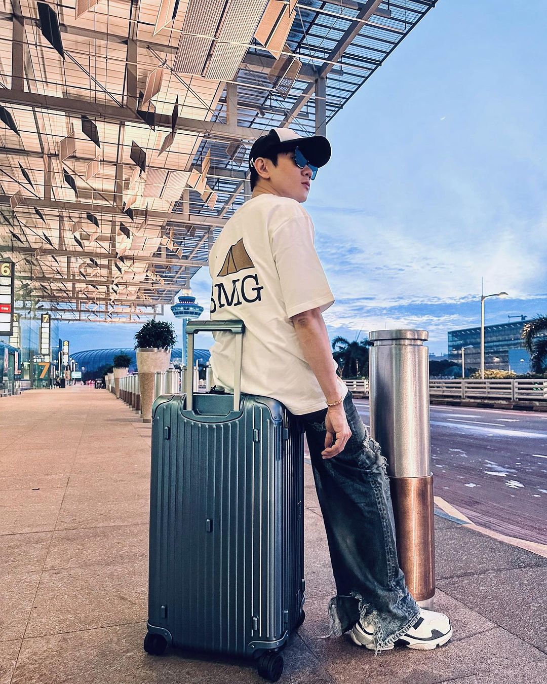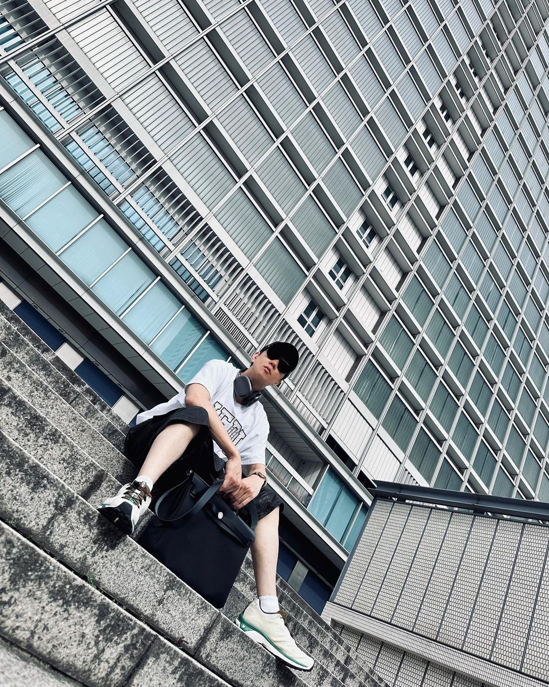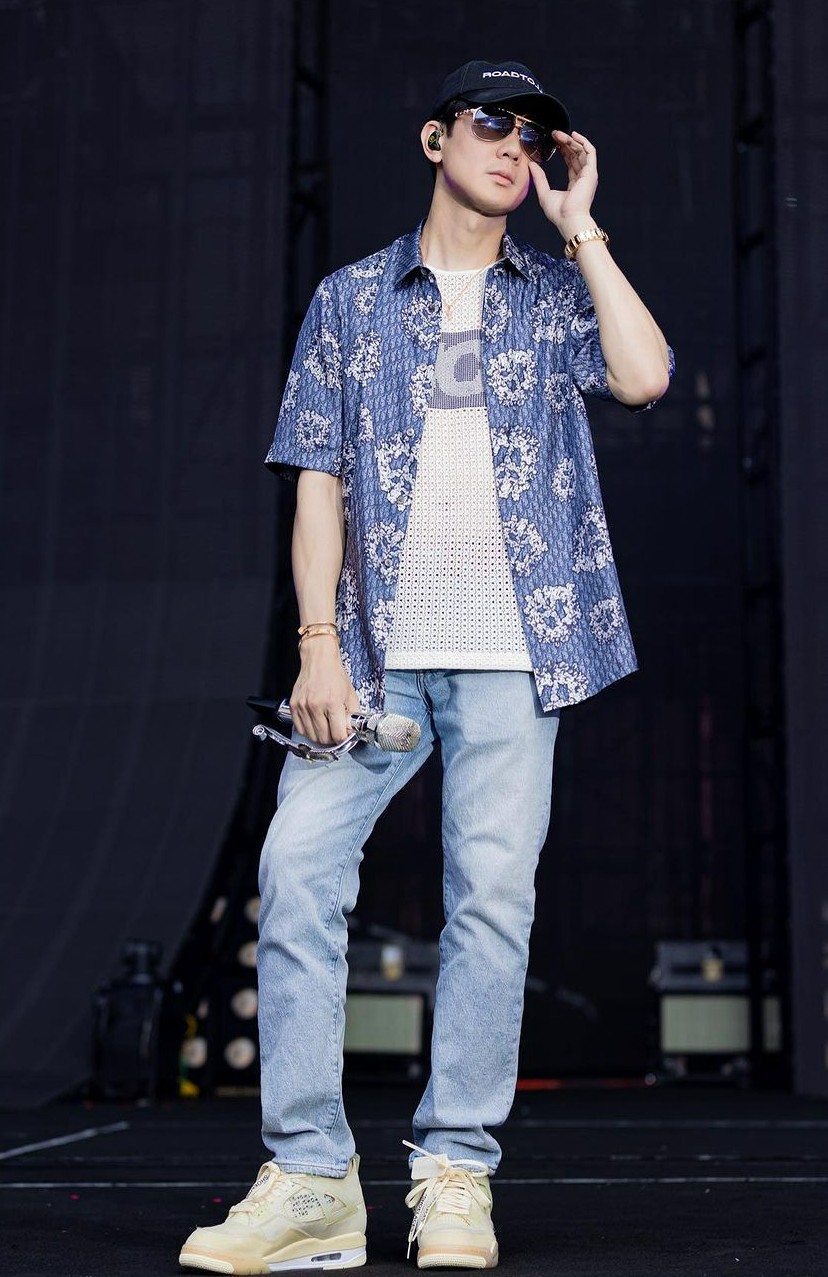 另一身造型更是没少往身上堆狠货,上身 Dior 无袖背心,脚上是 OFF-WHITE x Air Jordan 4。