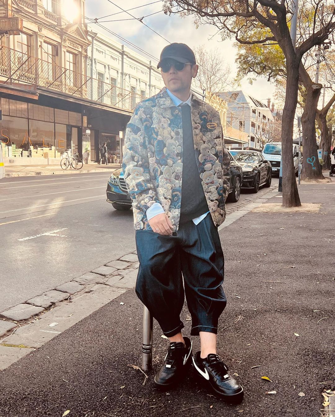 「纯黑倒钩」也没落下,还特意搭配了一件 Travis Scott 联名棒球外套。