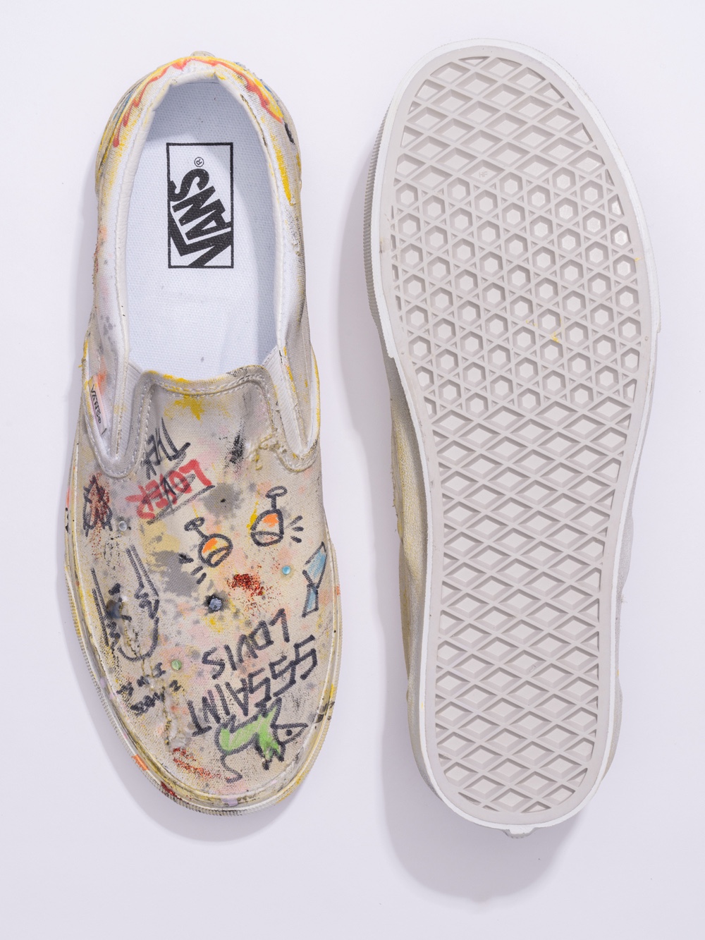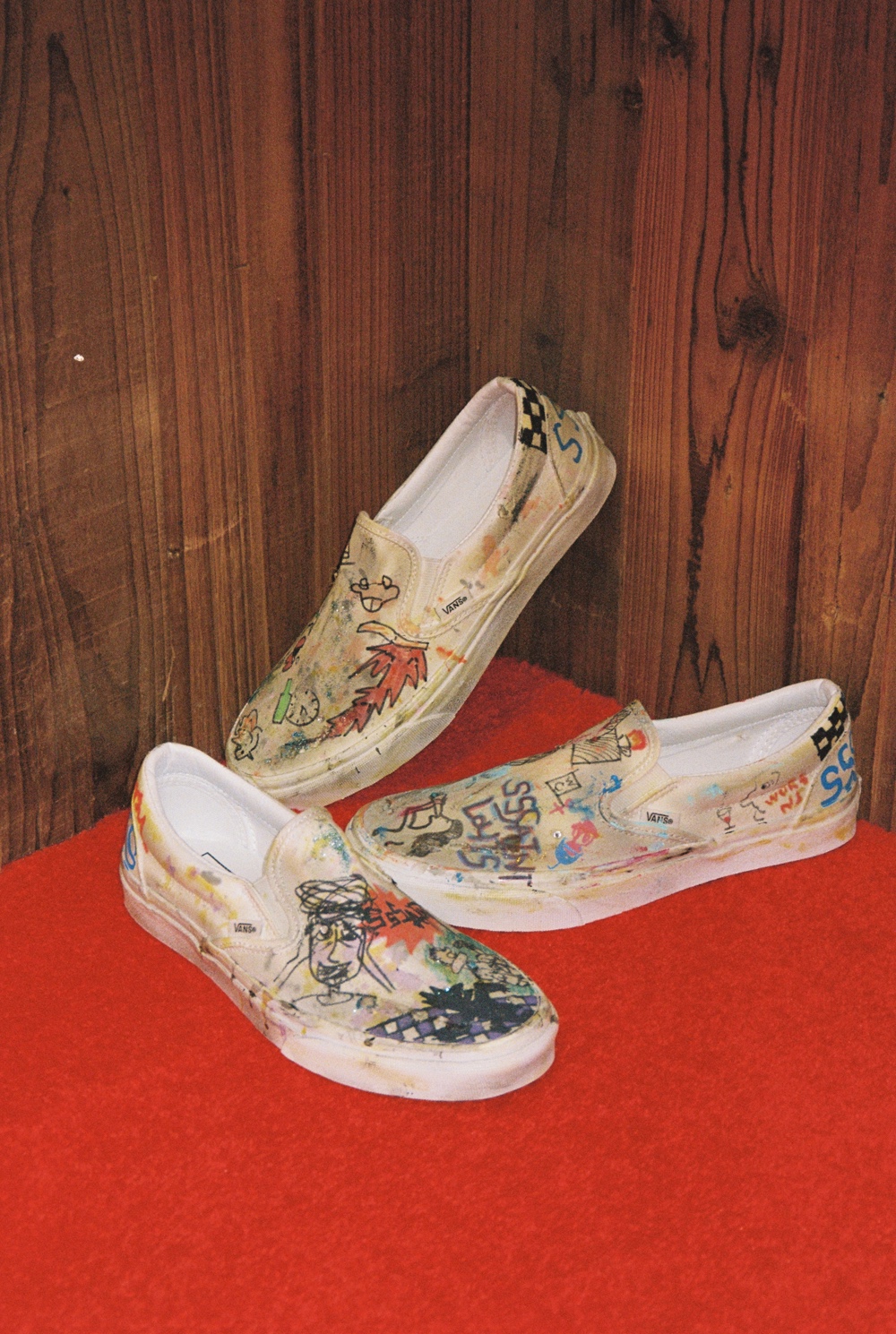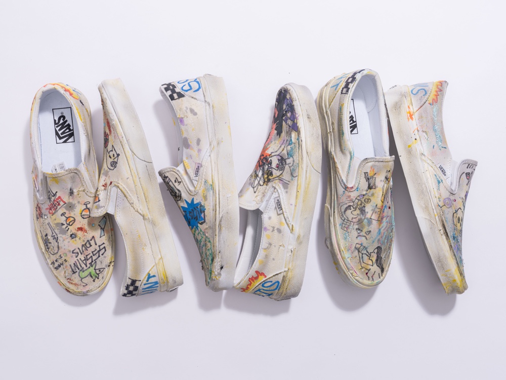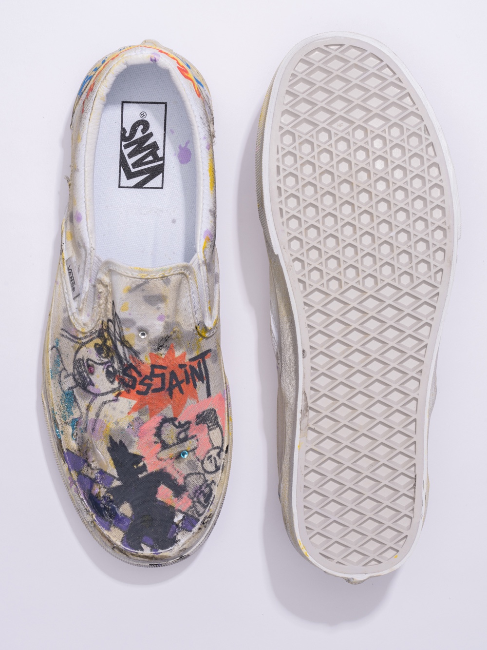 设计方面以 Sssaint Louis 独具一格的手绘泼墨和刻意破坏的风格呈现,每一道工艺均由手工独立完成,带来了三款围绕夜晚有关的 Slip-On。