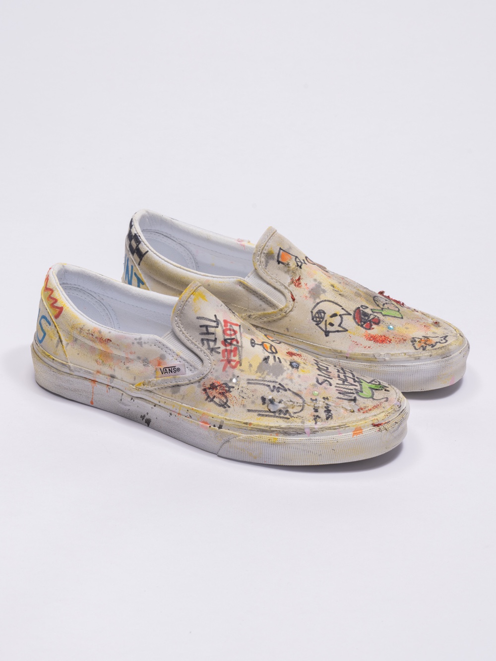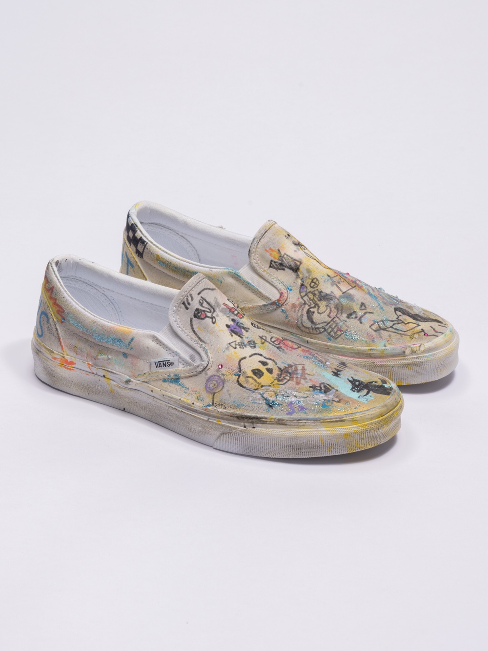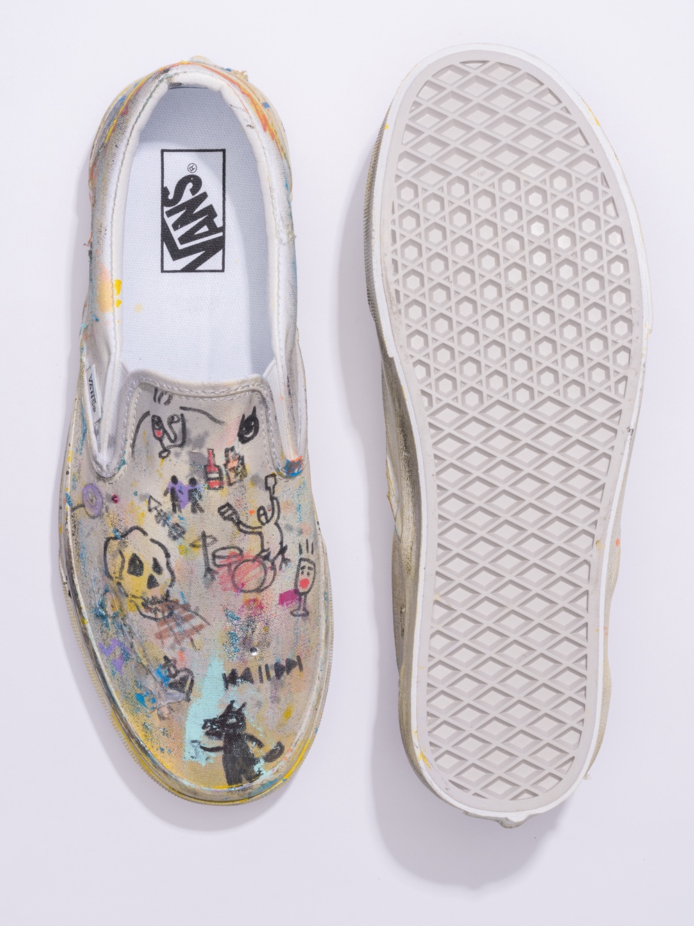设计方面以 Sssaint Louis 独具一格的手绘泼墨和刻意破坏的风格呈现,每一道工艺均由手工独立完成,带来了三款围绕夜晚有关的 Slip-On。