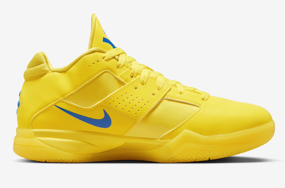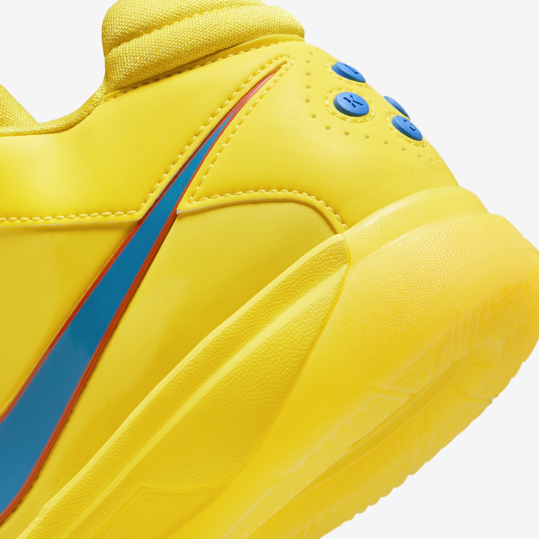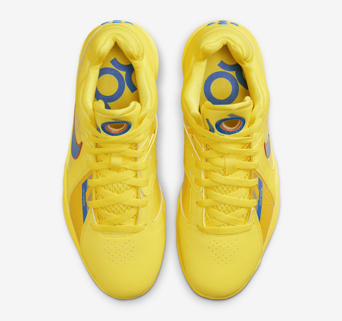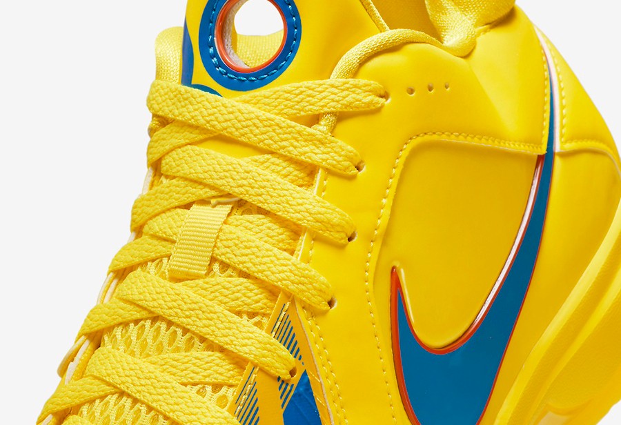 整双鞋与十三年前的造型一致使用了大面积黄色 + 蓝色组成,视觉效果格外醒目,这也与当年俄克拉荷马雷霆队主调形成了呼应。