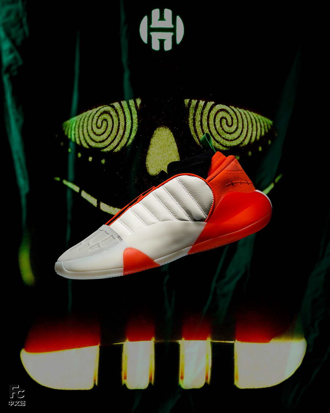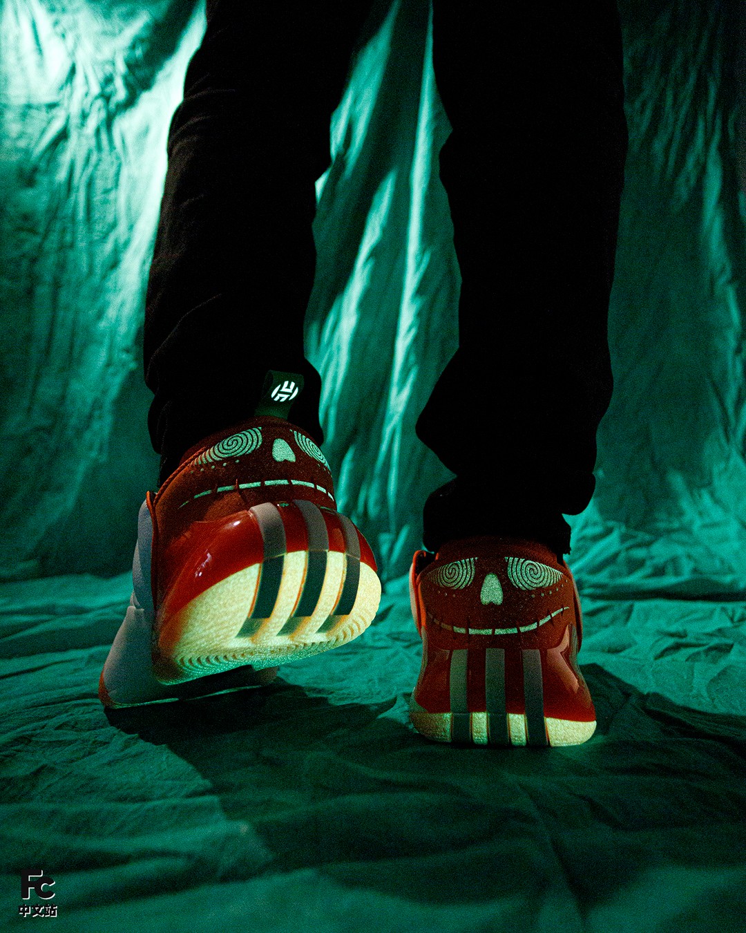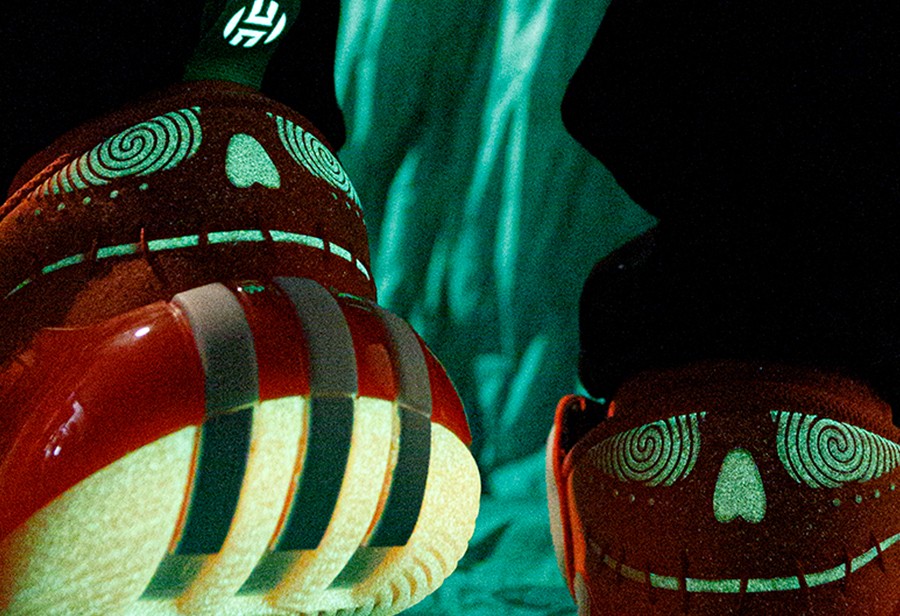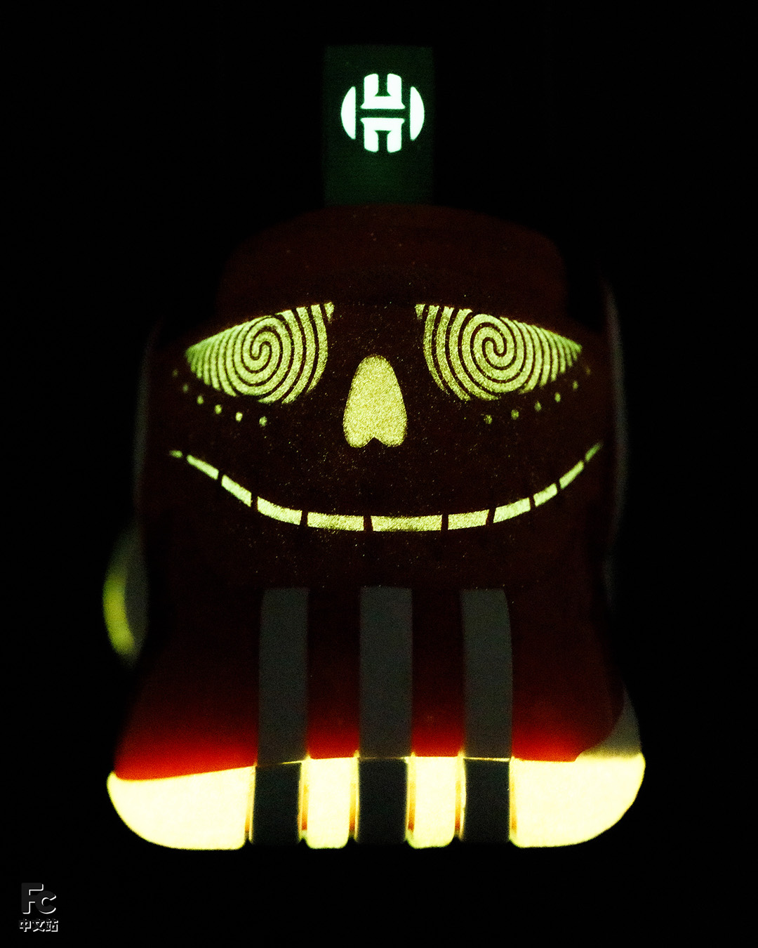 更不用说后跟的鬼脸,旋涡般的眼神看久了真有种要被催眠的感觉,另外就连鞋提上的哈登 Logo 都能散发荧光,细节拿捏得相当到位。