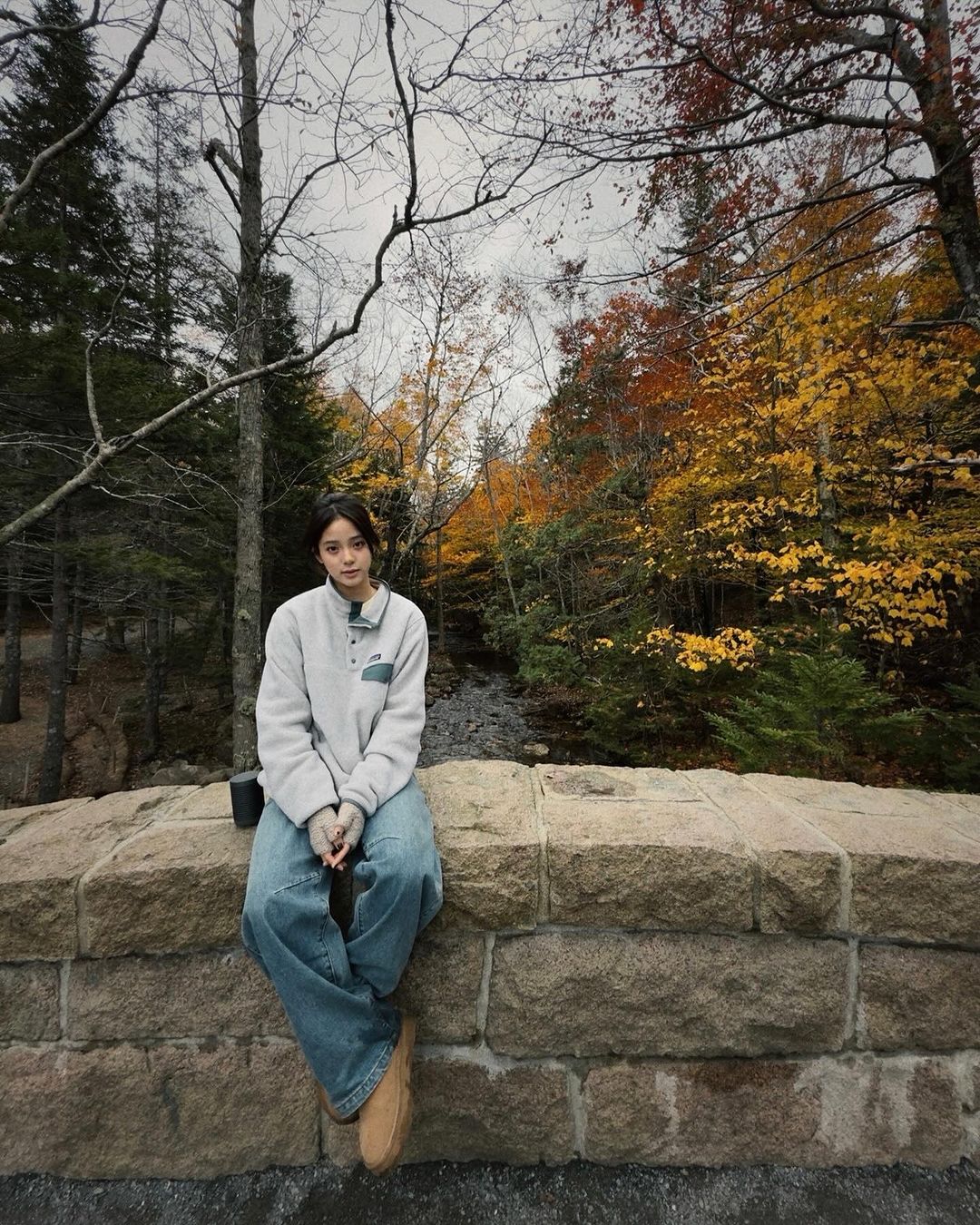 去徒步的欧阳娜娜上身 Patagonia Snap-T,脚踩 UGG,各种穿搭氛围切换自如。