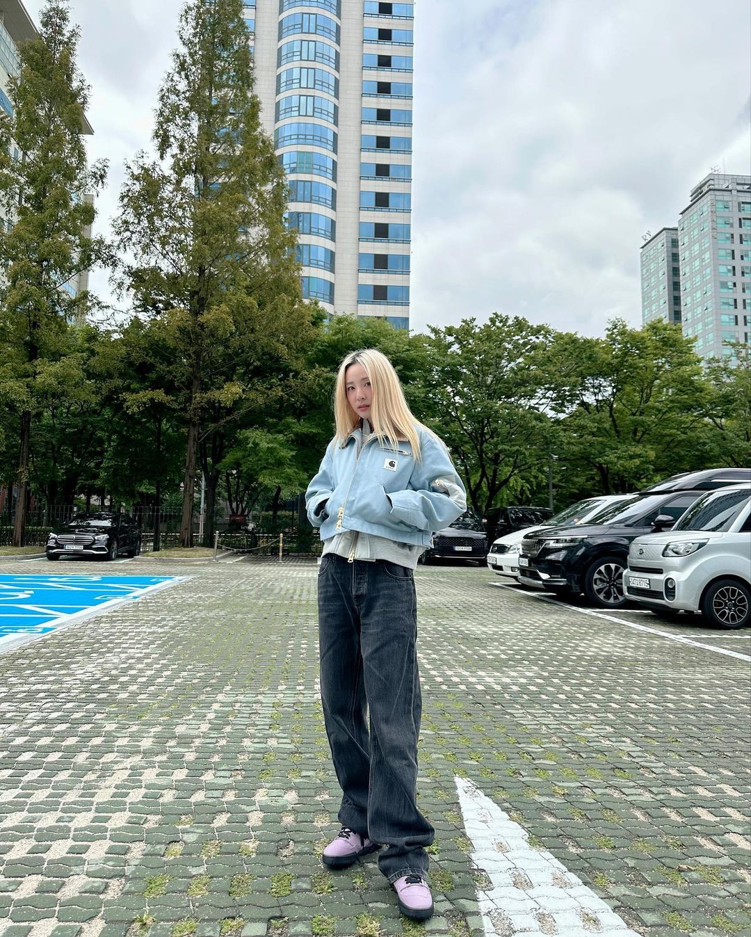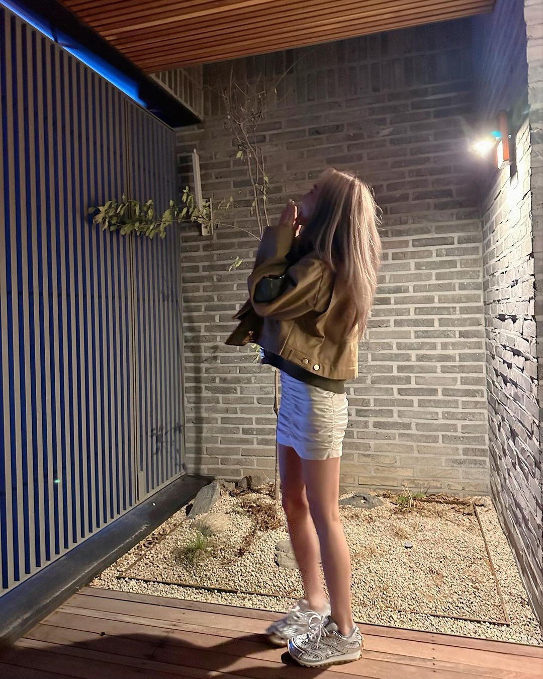 浅色包臀裙外面穿了件 sacai x Carhartt WIP 夹克,这件王炸单品将近一万人民币。