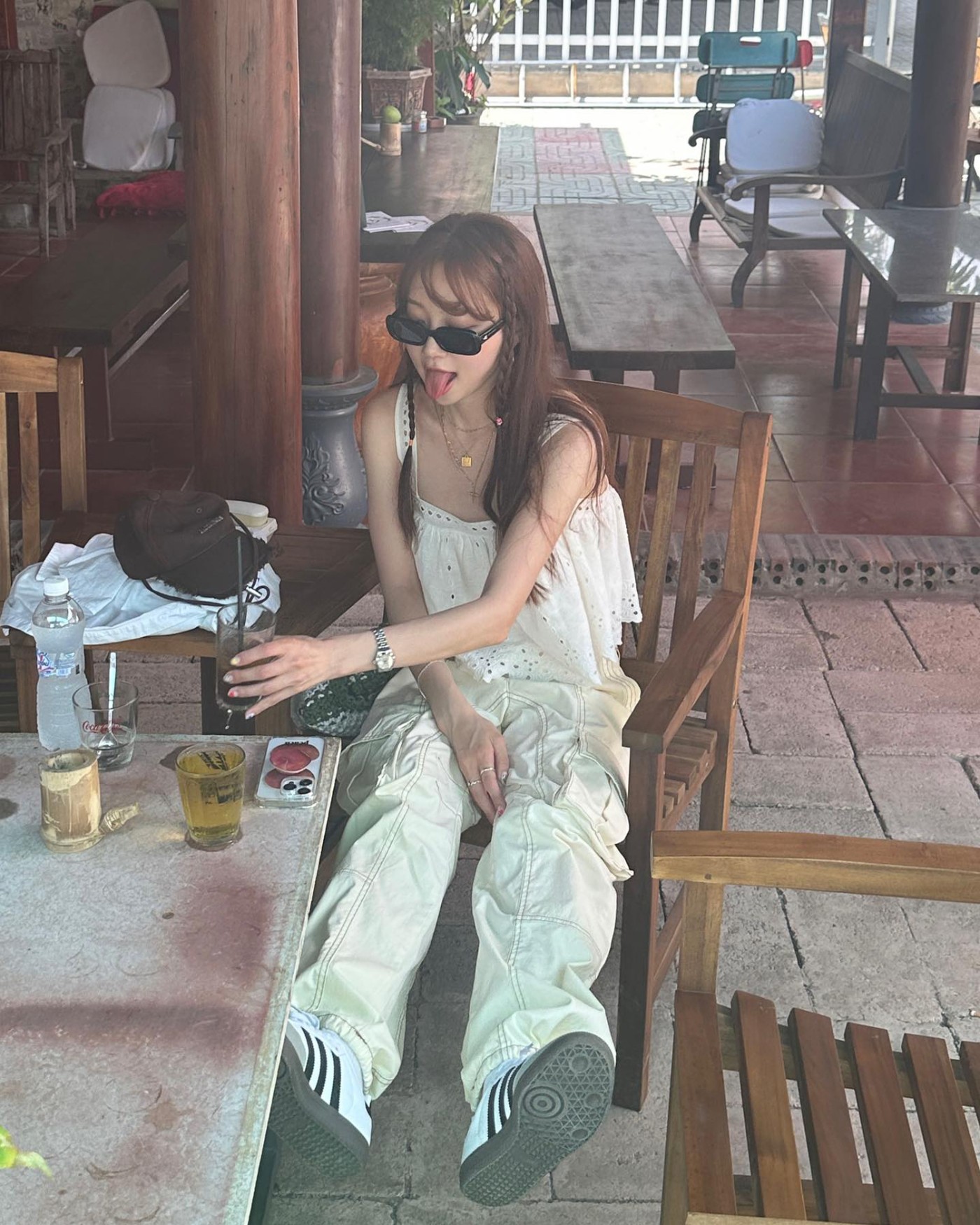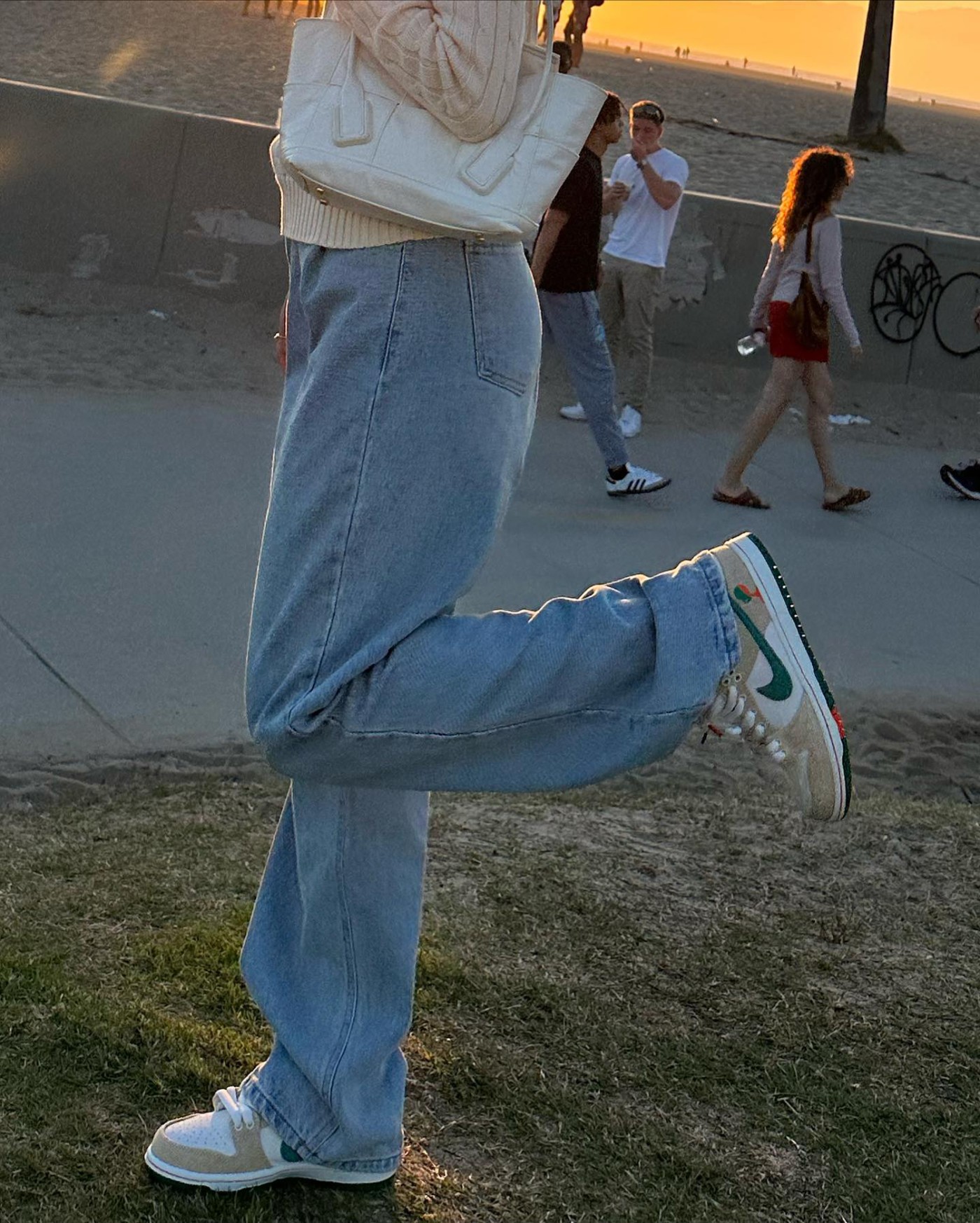 海边放松时还上脚了 Jarritos x Nike SB Dunk Low,白色针织衫 + 牛仔裤 + Dunk 的固定搭配的确怎么穿也不会错,实打实的将邻家感散发,妥妥潮流版德善。