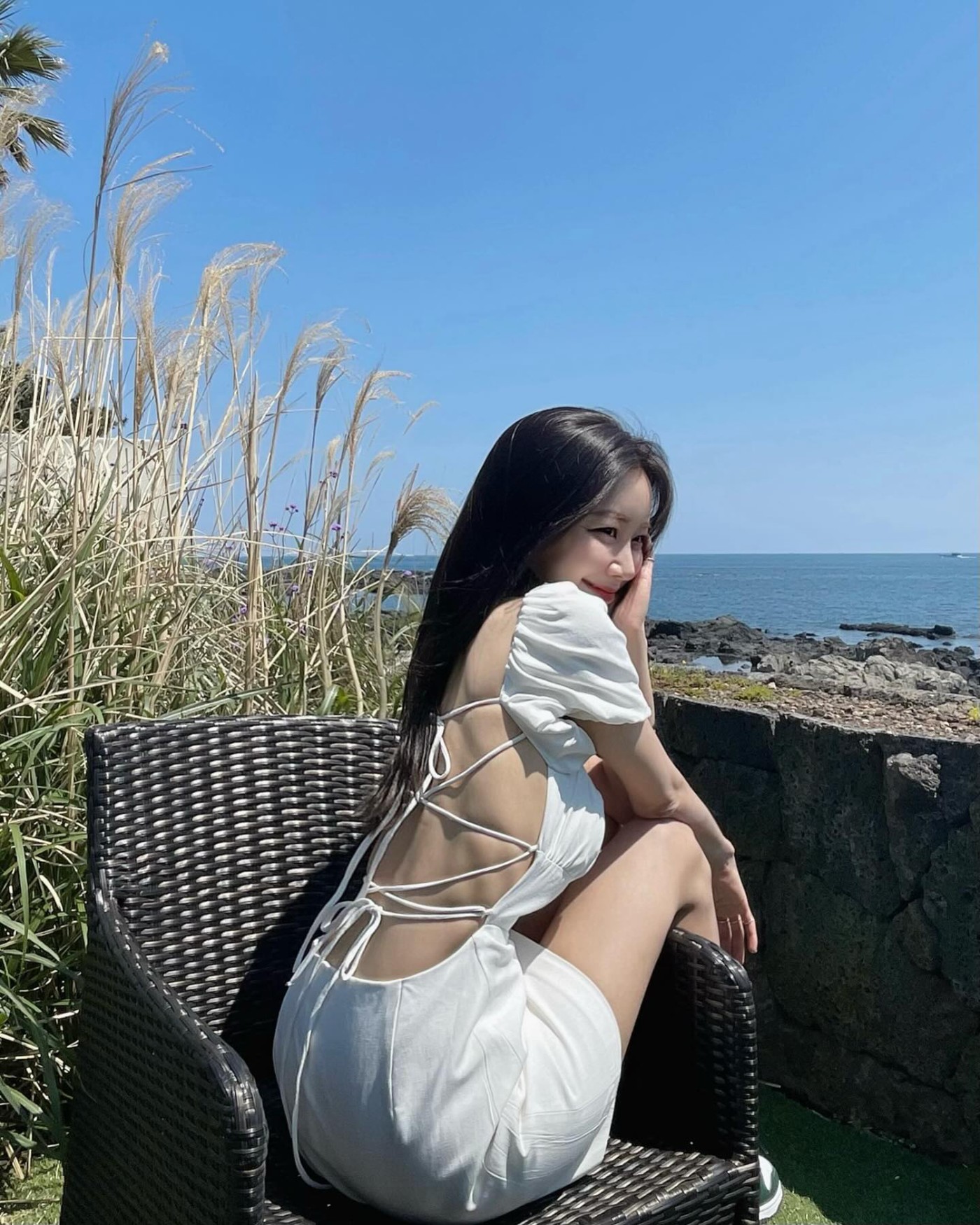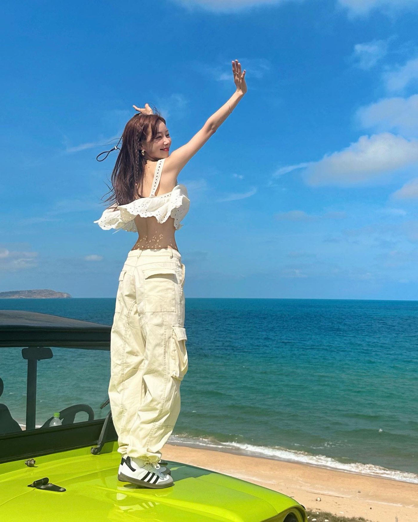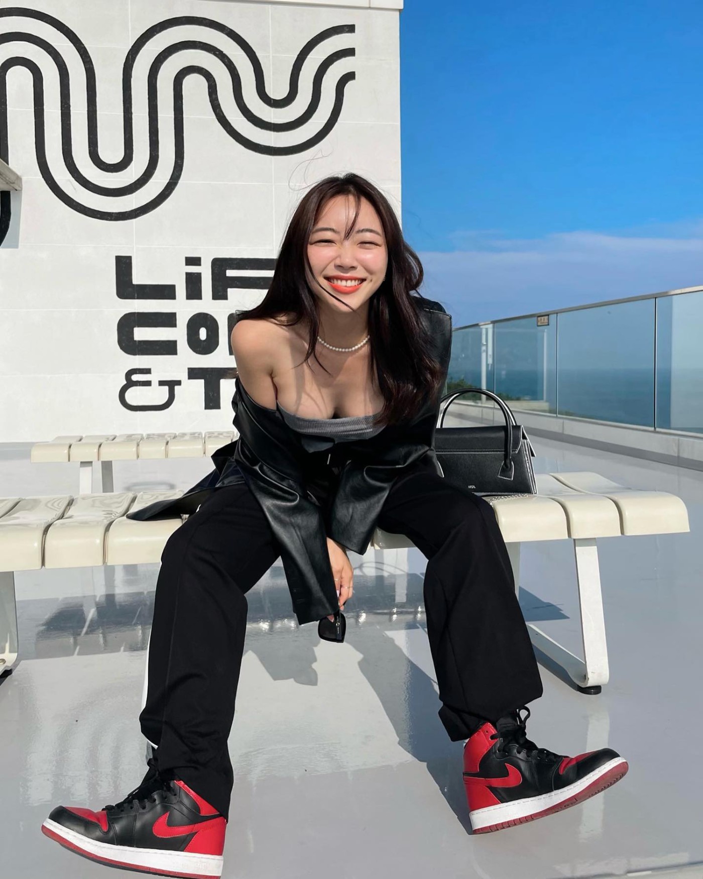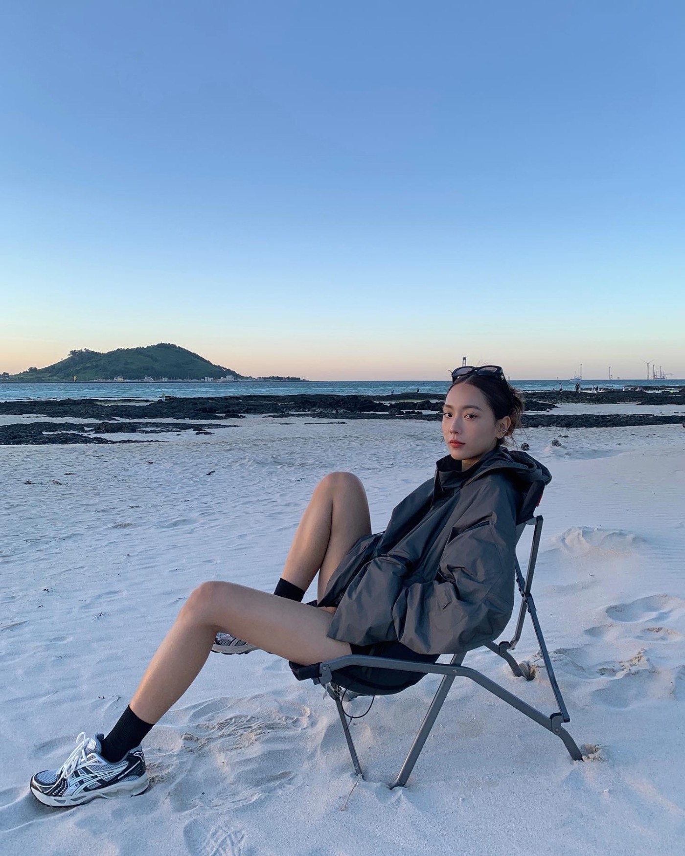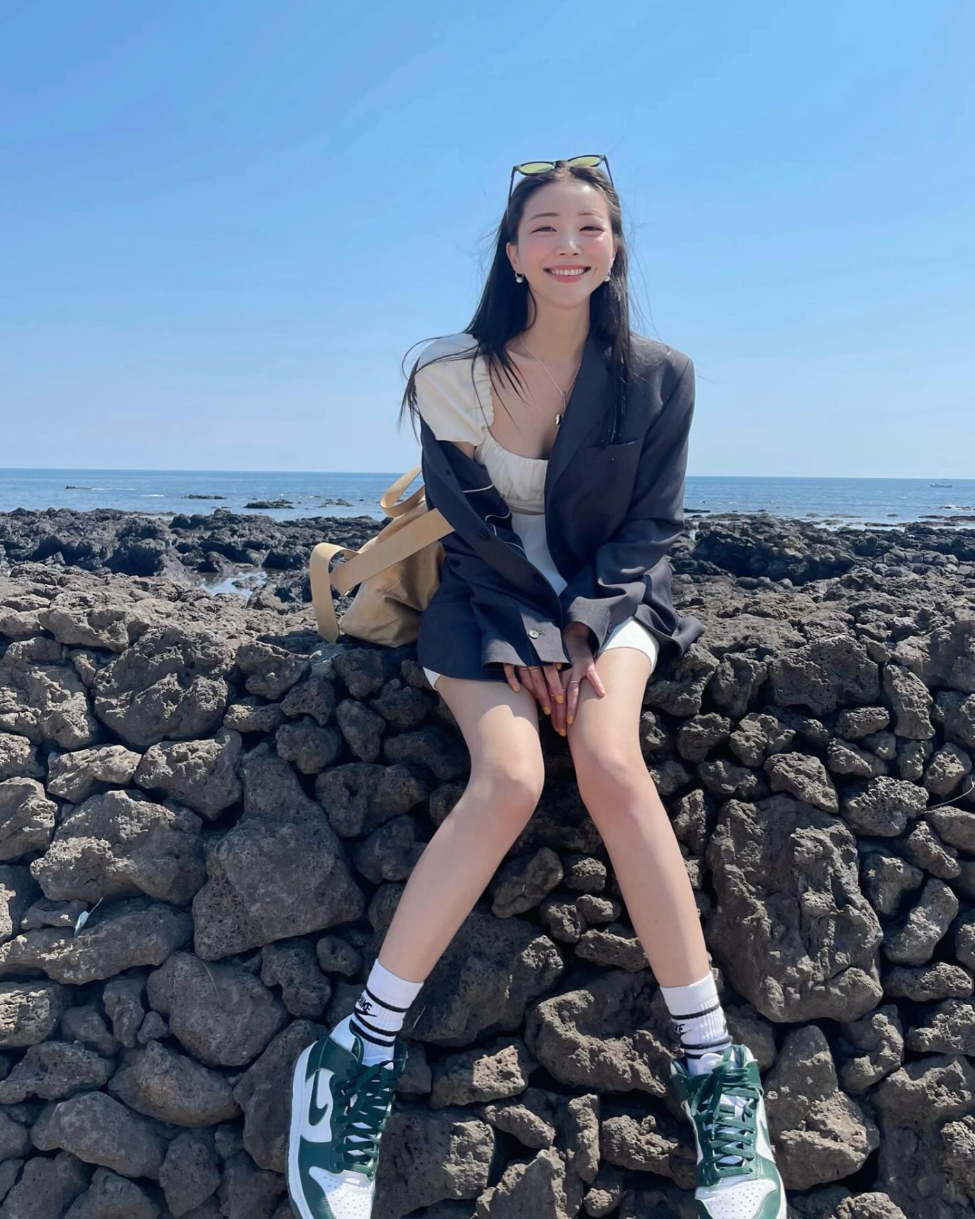 在海滩玩的时候,一袭白色连衣裙加上西服外套和 Nike Dunk Hi,呈现美且自知的感觉,甜美至极。