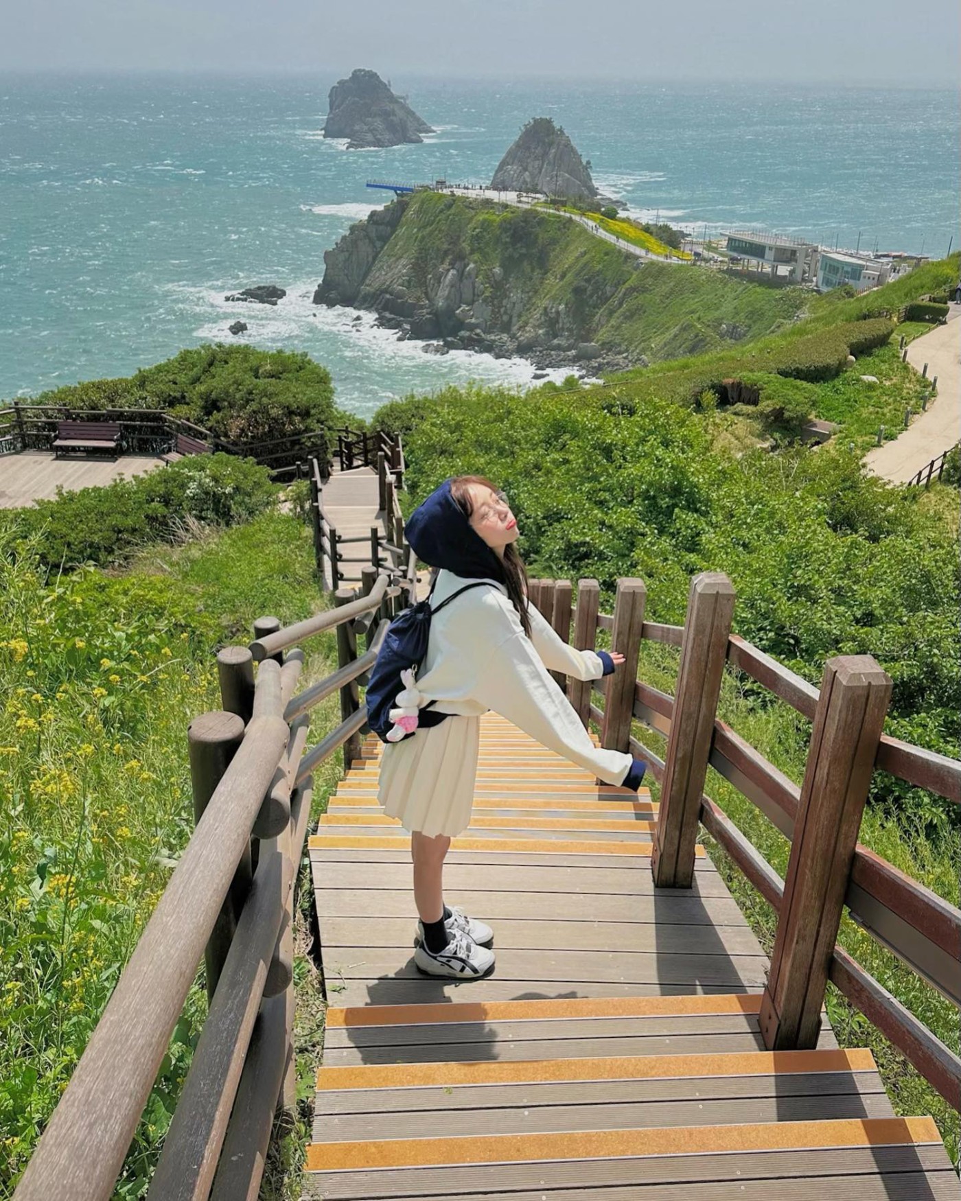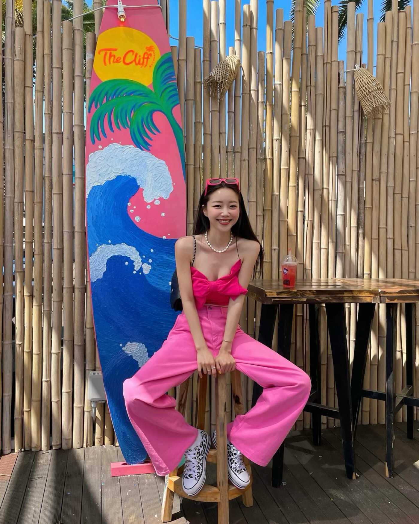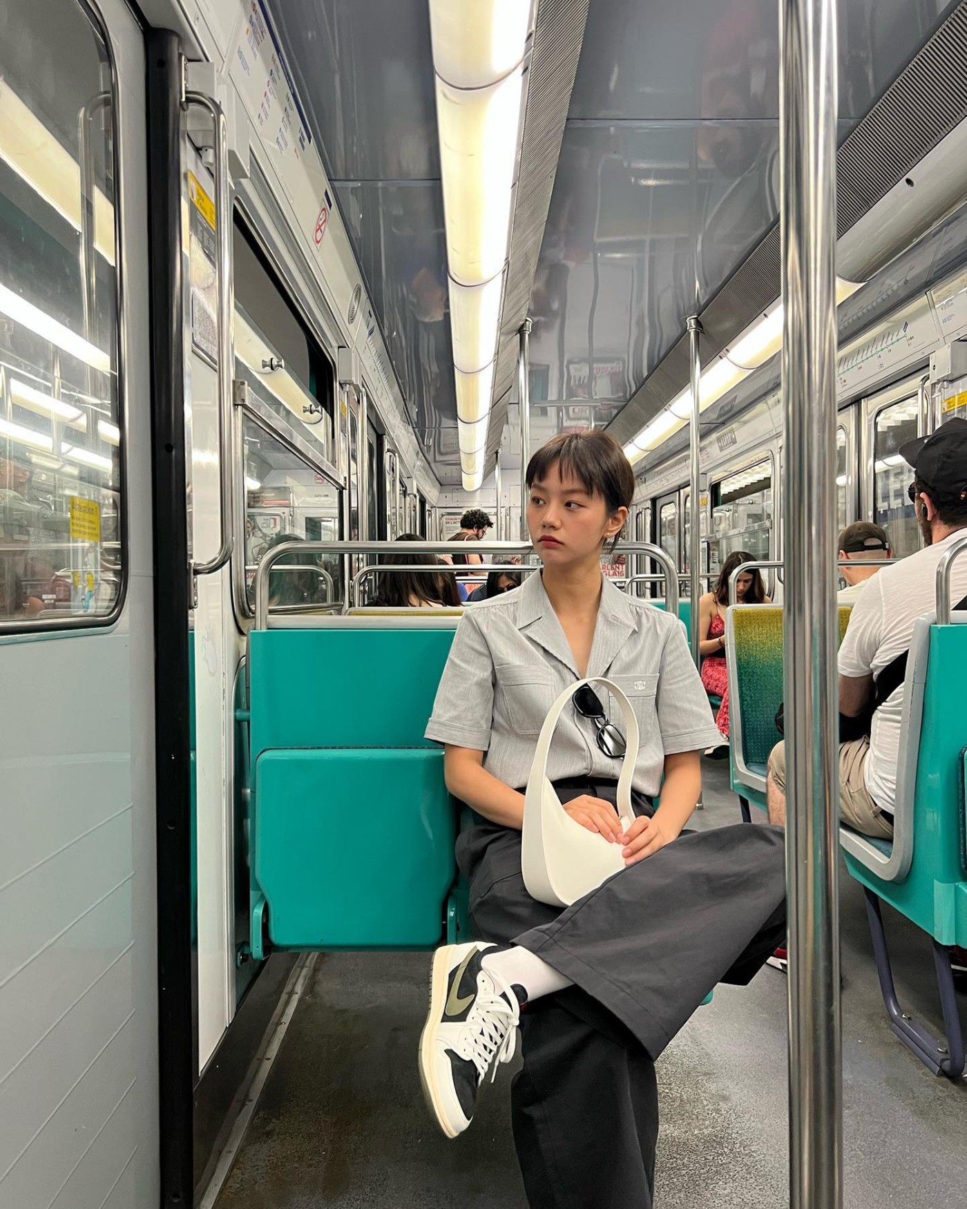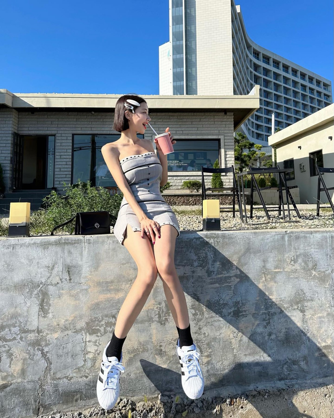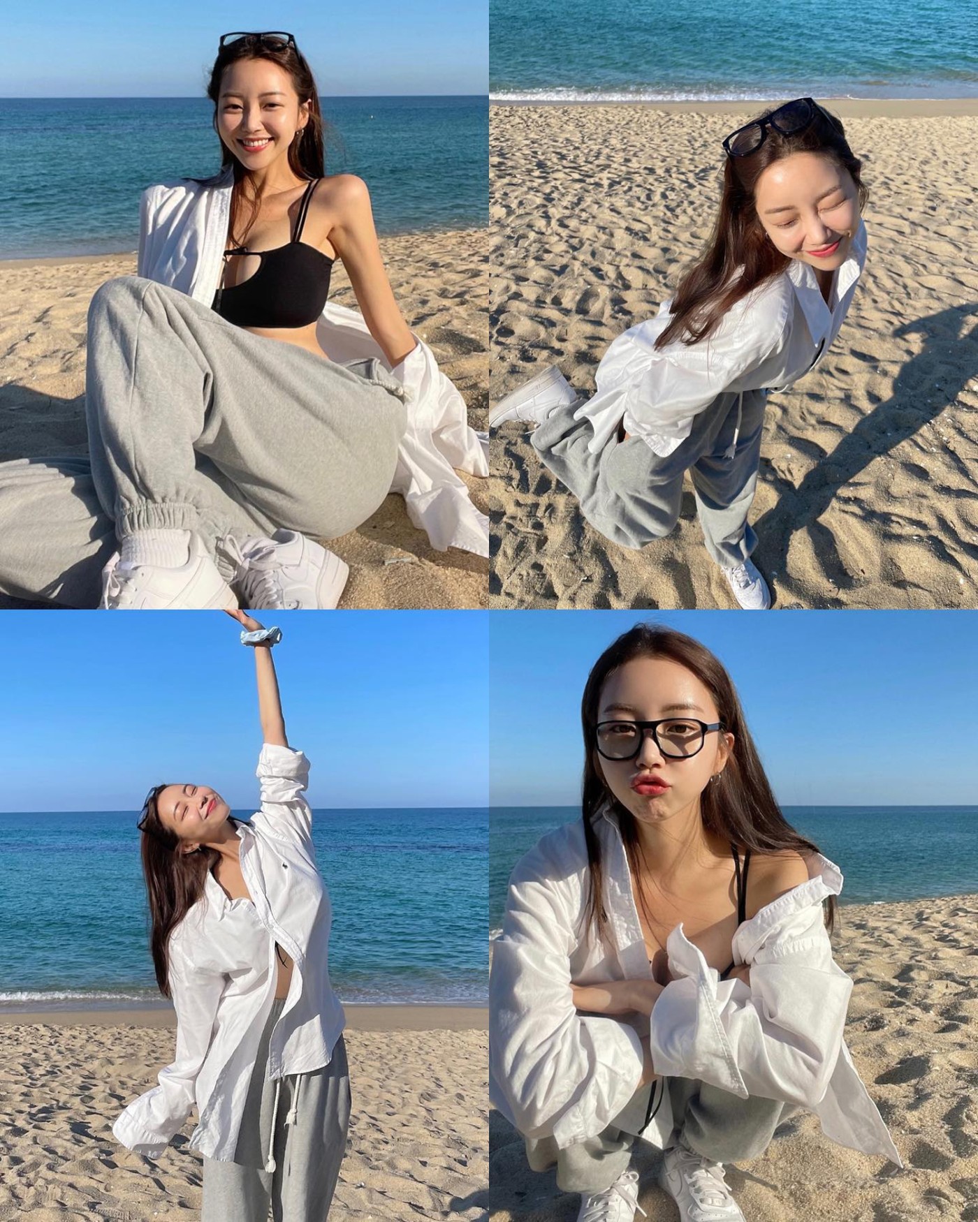 在海滩玩的时候,一袭白色连衣裙加上西服外套和 Nike Dunk Hi,呈现美且自知的感觉,甜美至极。