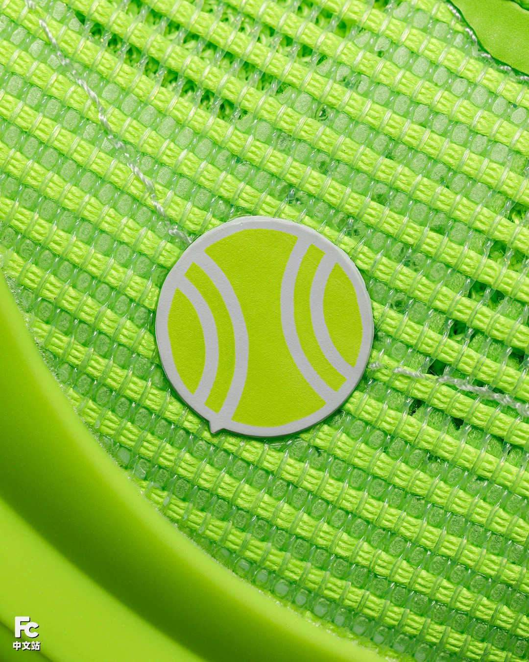 鞋舌白色 Logo 略带凹陷,对应网球上白色的沟壑。