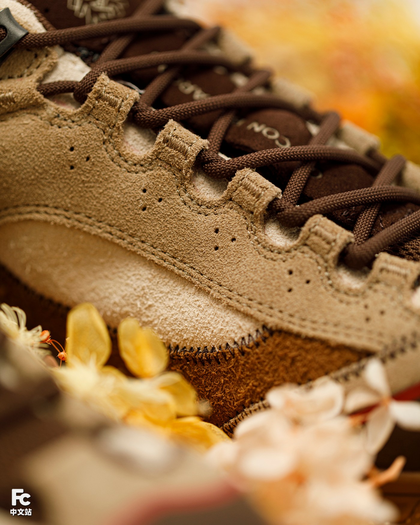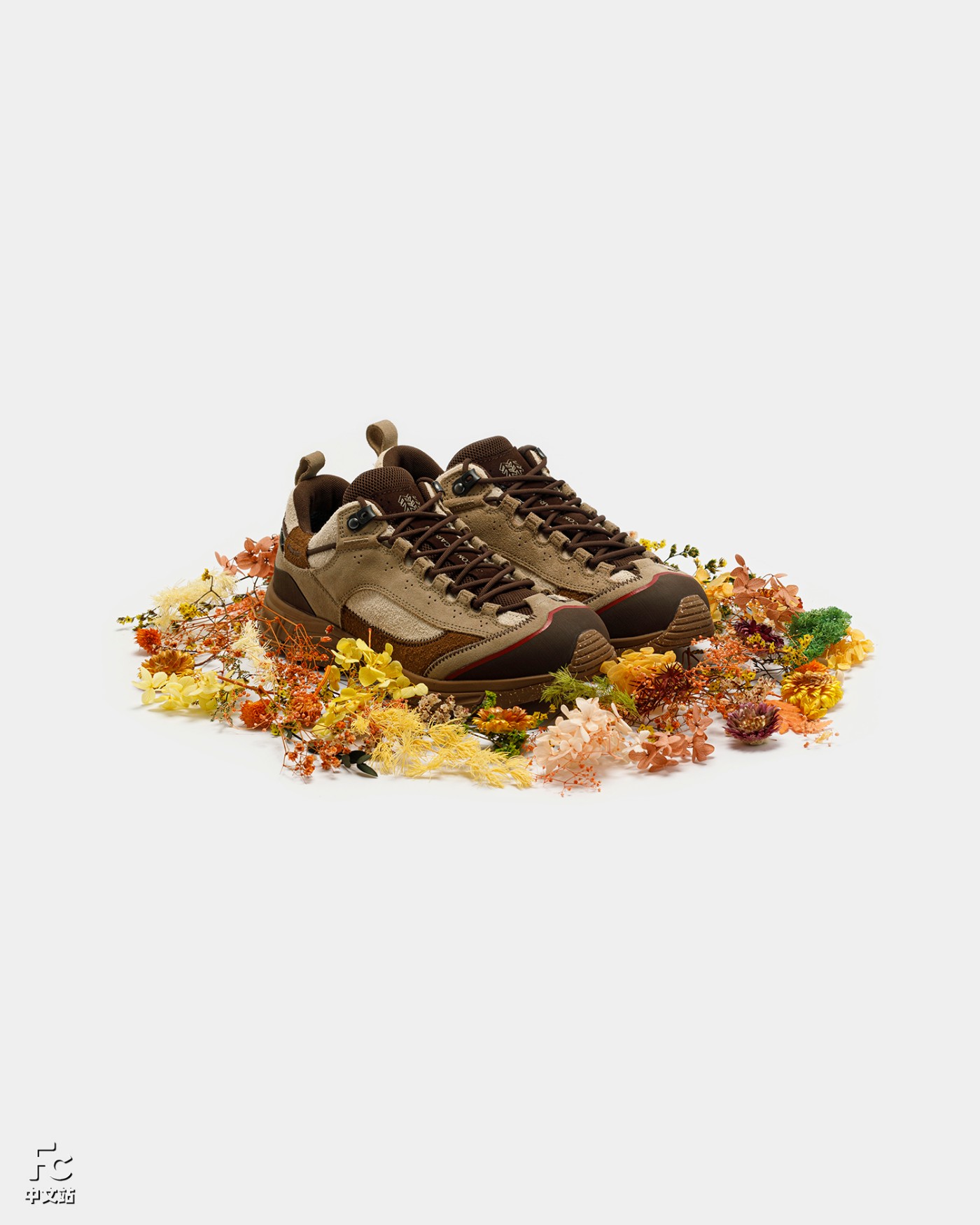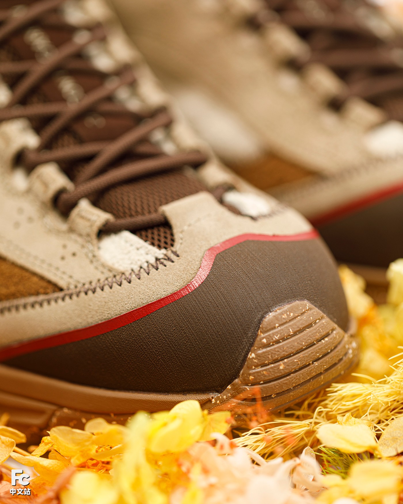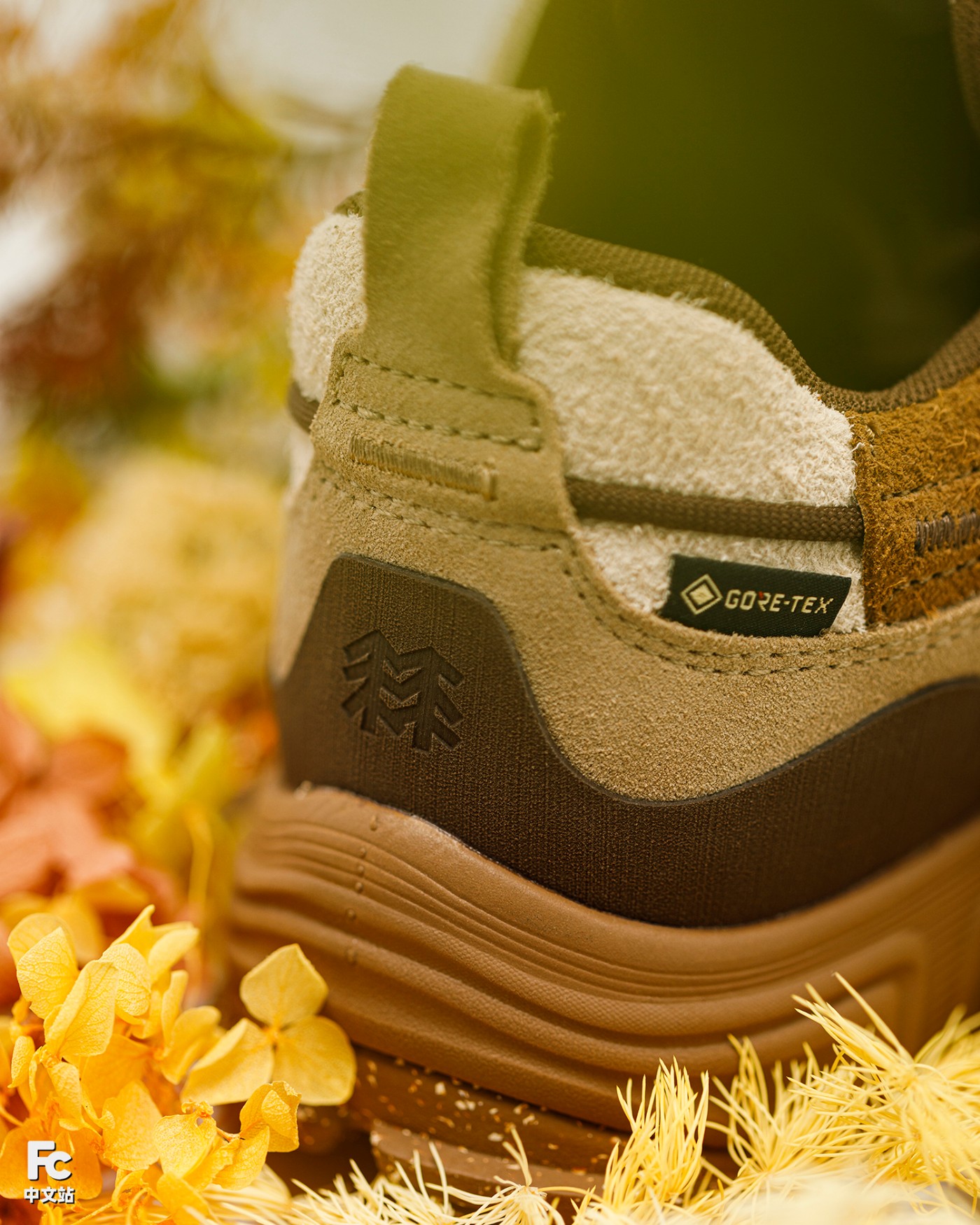 鞋身翻毛皮与磨砂皮材质的共同运用,既丰富整体的视觉层次,又通过木质色系的覆盖与大自然的户外氛围相结合,带来独具新意的意境呈现。