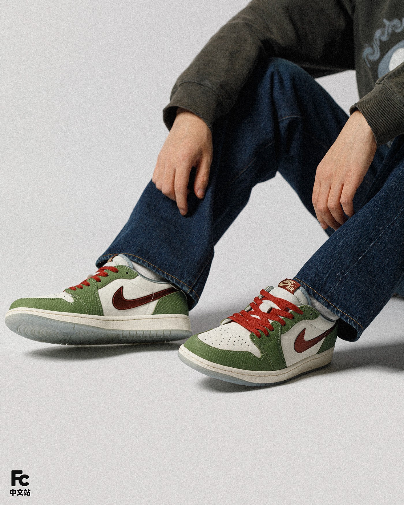 而龙年 AJ1 整体全部以皮革包裹,绿色部分的龙鳞纹理,Swoosh 以酒红色示人,与鞋身形成了撞色,符合东方的韵味。