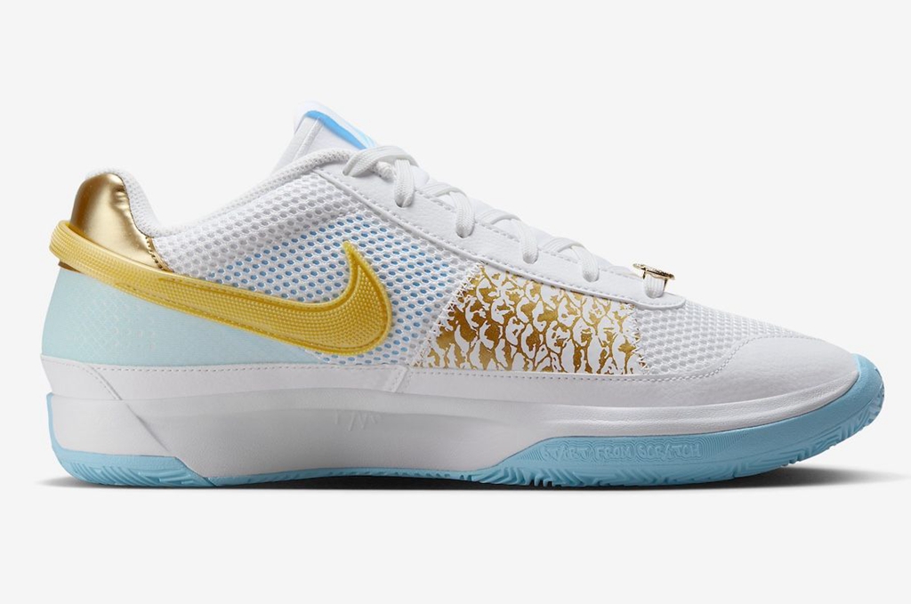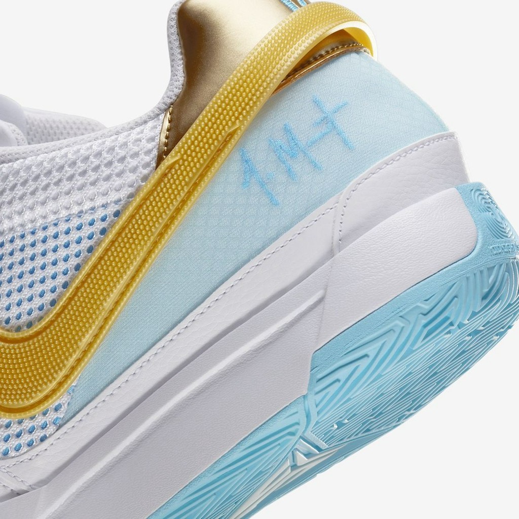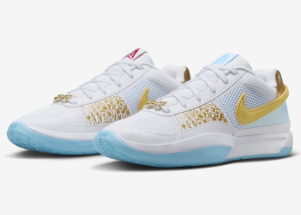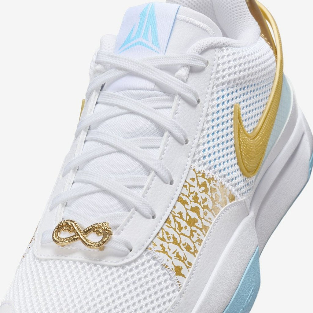 从曝光之初就备受好评的 Nike JA1 CNY,最近终于迎来正式发售! 颜值方面,没有使用传统的大红大紫,而是以清爽白色与蓝色示人。 鞋面金色龙鳞图案不仅不抢戏,还丰富了细节表现,成为鞋款最具辨识度的细节。 鞋头还有龙形的无限符号,采用金色电镀覆盖。 虽然说不上颜值天花板,但放眼近几年的 Nike CNY 系列,这双也绝对算是耐看的。 目前已经正式登场,国内市价在 ¥6xx 元左右,还是很香的,喜欢的朋友不妨抓紧时间入手。