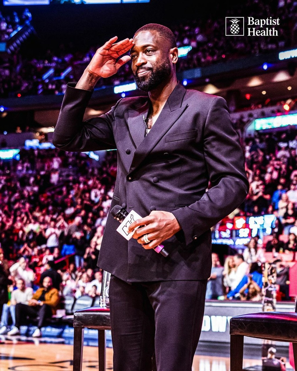 此次出席仪式,韦德选择穿着一身休闲黑西服,里面则内搭白色背心,继续彰显着自己 “骚韦” 的气质。