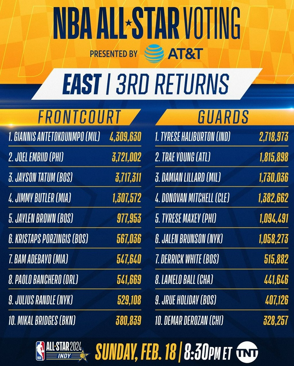 除此之外,今年 NBA 全明星投票第三轮已经正式结束,不过结果基本和第二轮没有区别,字母哥和詹姆斯依旧是东、西部票王,小编也就不在此多赘述。