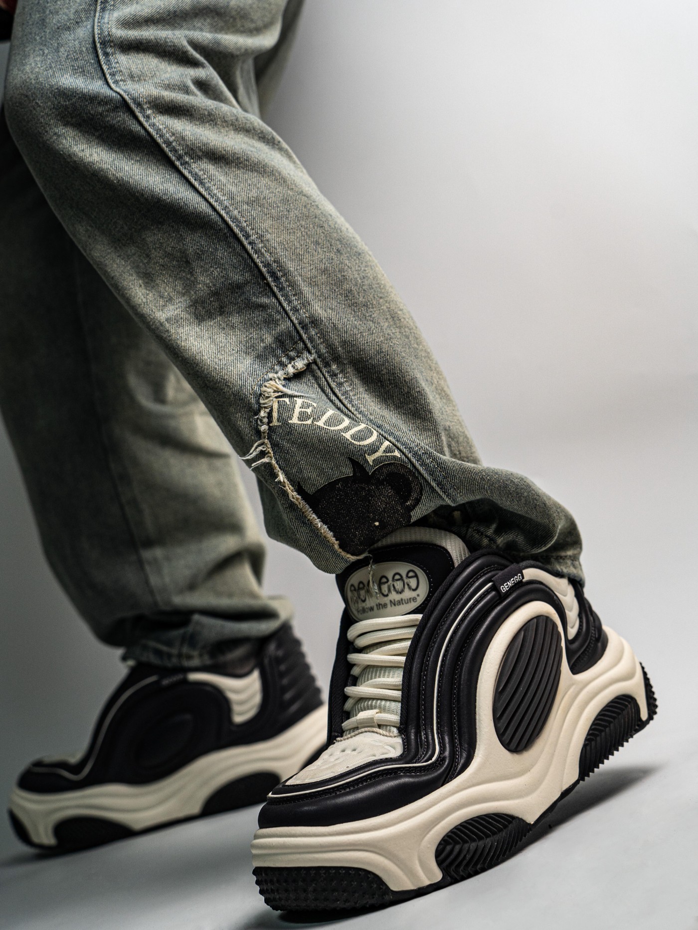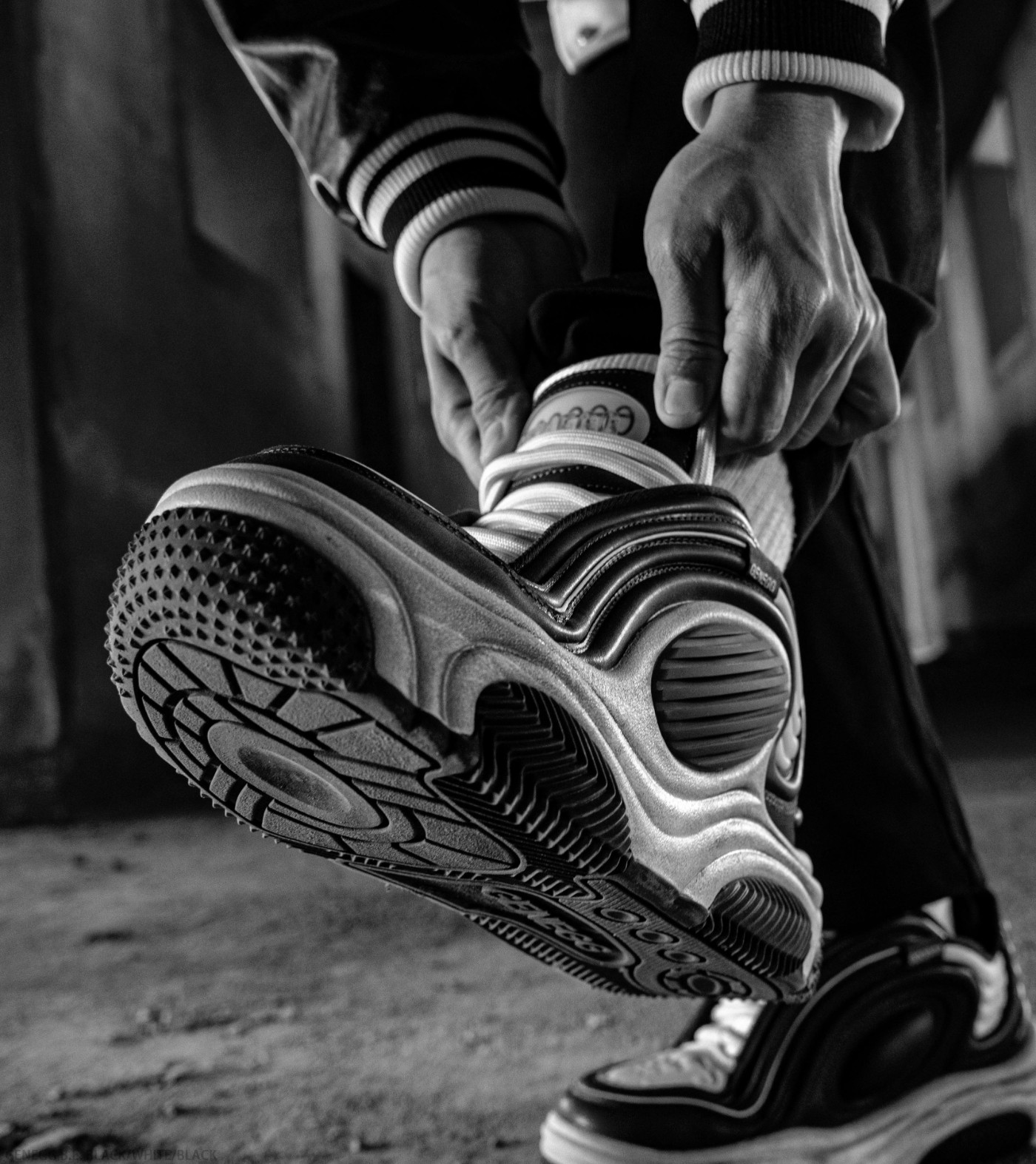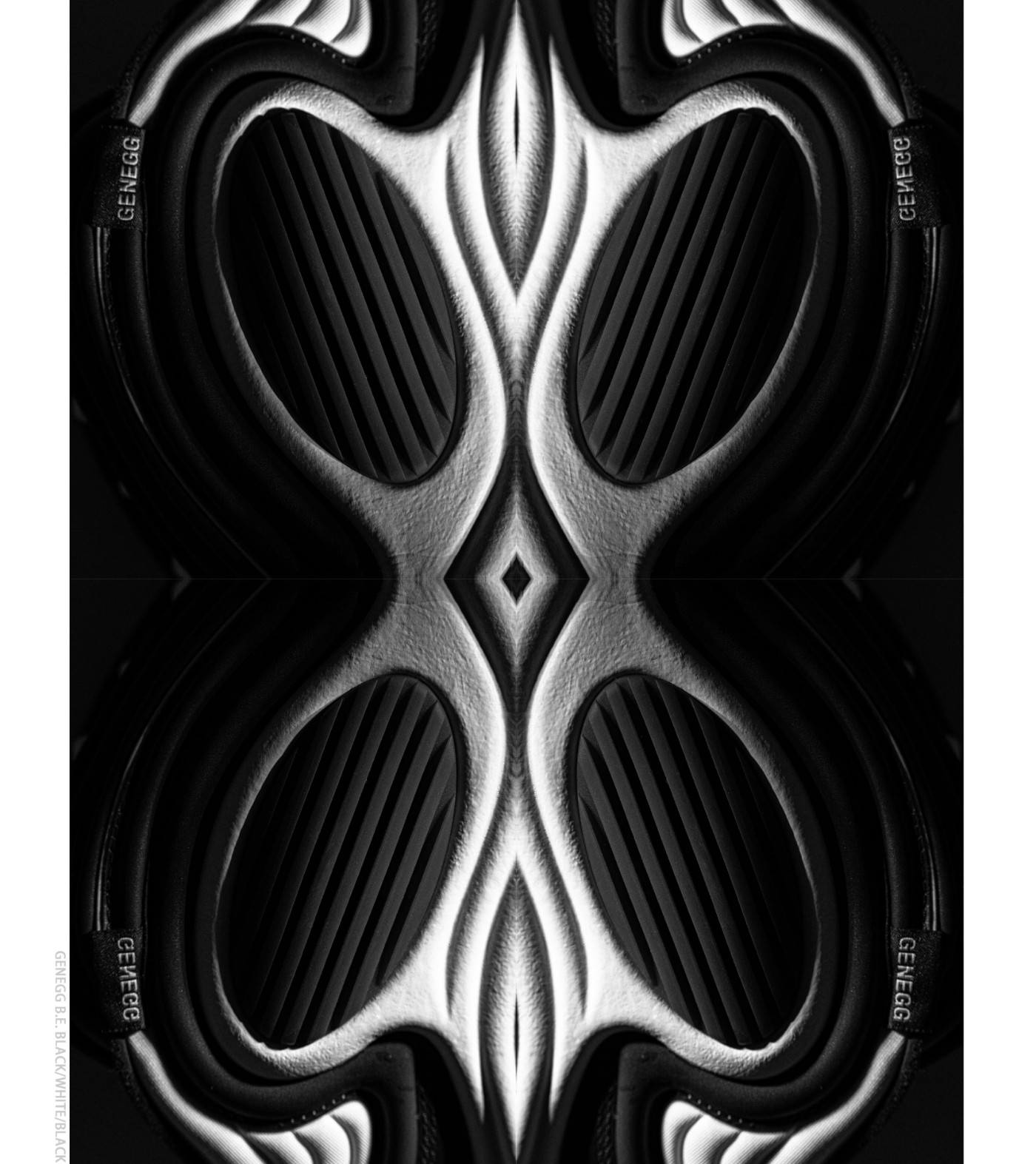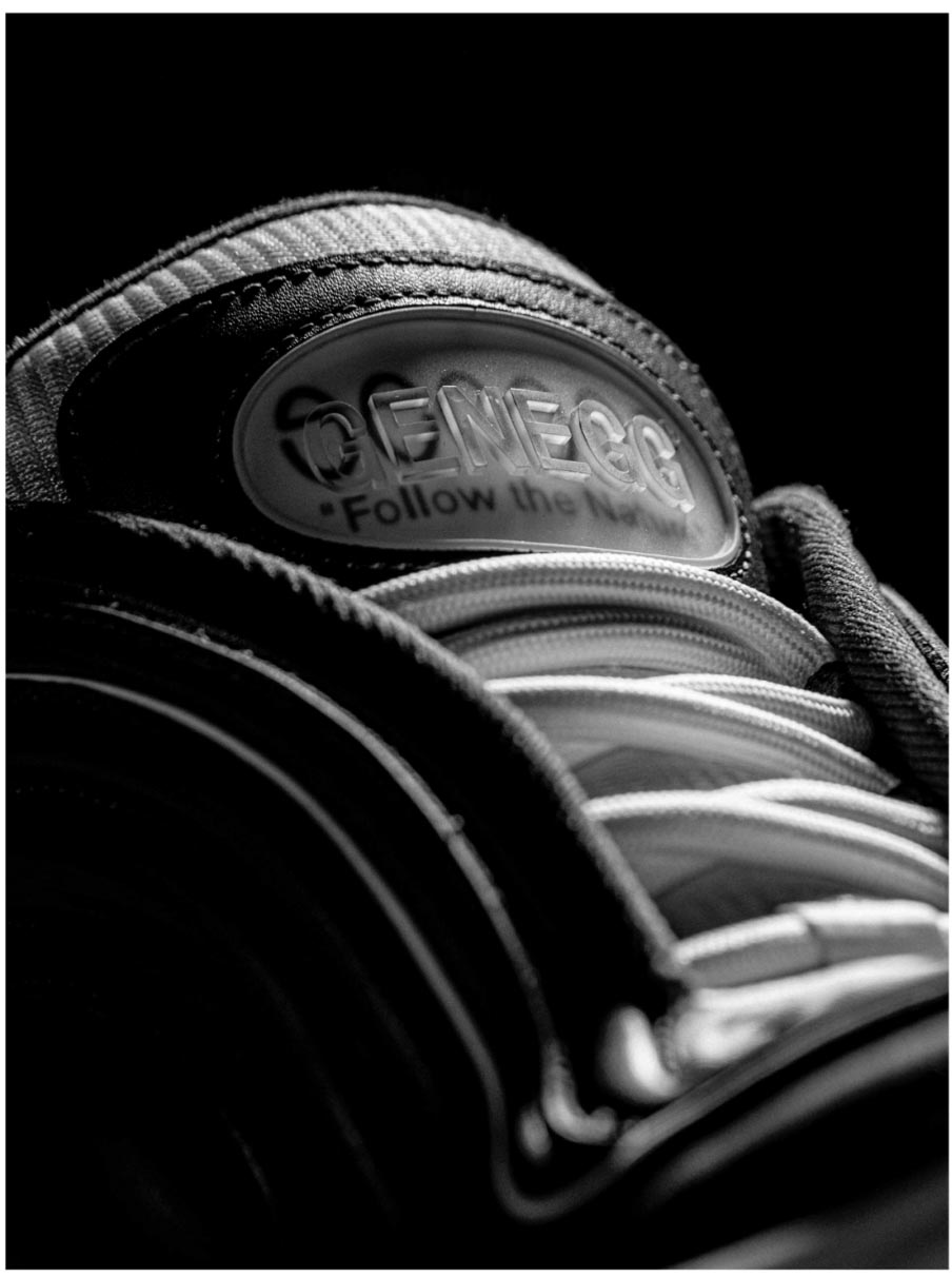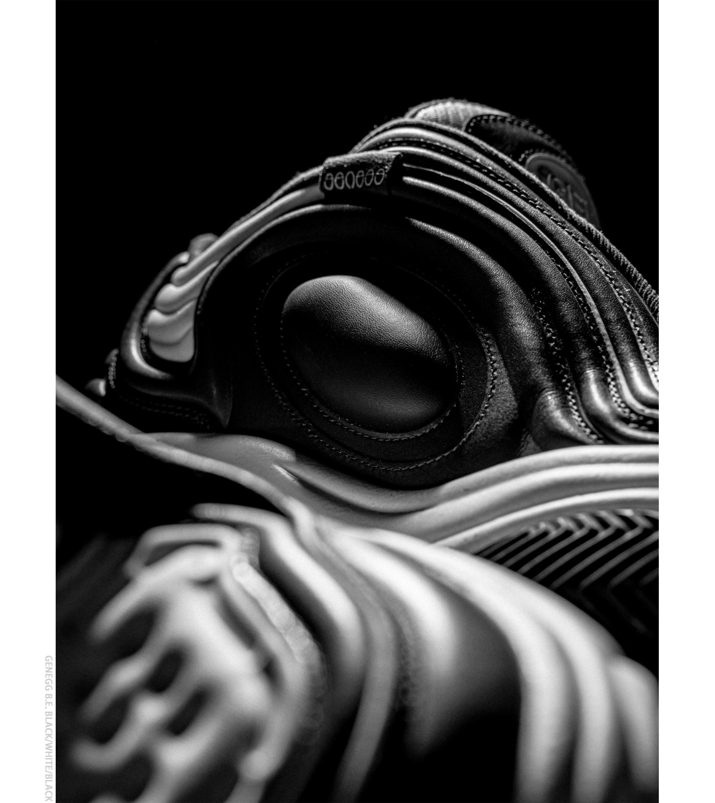为突出 GENEGG 的先锋理念鞋面大部分采用新型可回收材料,同时局部采用真皮和网布材质在丰富鞋面层次感的同时增加其透气性和质感。