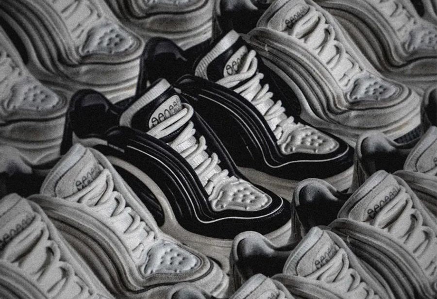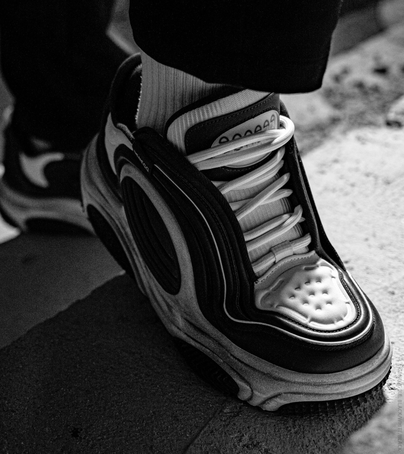 延续此前「鲸鱼鞋」上的标志性设计,蛋形格栅被设计到了鞋身侧面,看似鞋身侧面,实则是镶嵌在上翻的中底之中,不经意间与鞋身流线融为一体。