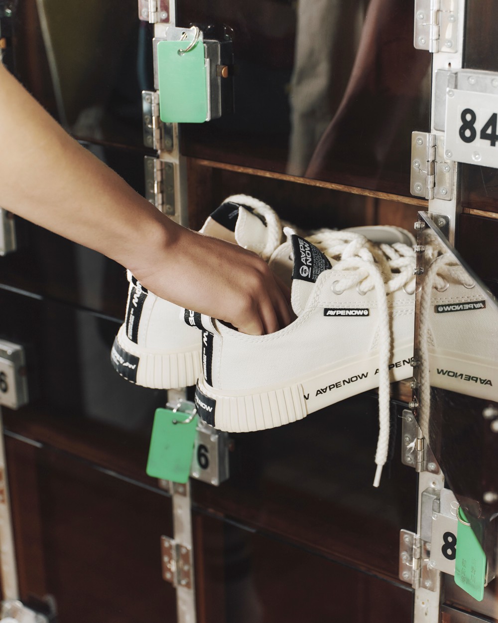 鞋款则是百搭不挑人的帆布板鞋,粗制麻绳鞋带搭配中底点缀的 AAPENOW 字样串标,更具街头氛围。