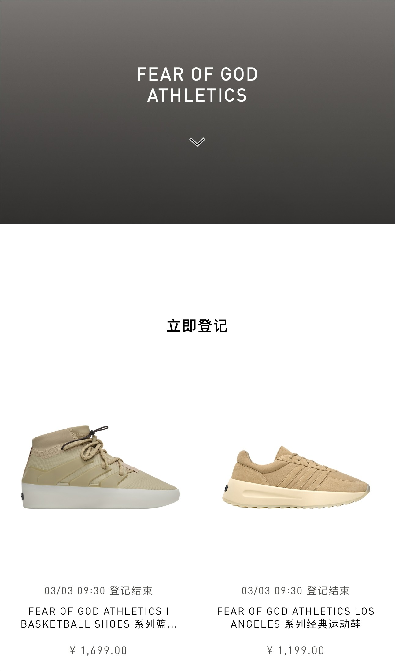 目前两款鞋处于登记环节,各位一定记得在登记截止之前参与,其中 Fear of God Athletics 1 Basketball 篮球运动鞋定价为 ¥1699 元,Fear of God Athletics Los Angeles 运动鞋为 ¥1199 元。