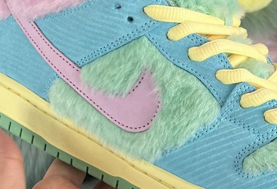 整体风格可谓是相当 Verdy 了,将毛绒公仔 Visty 的形象融合进鞋面设计,色彩搭配颇有复活节彩蛋的感觉。