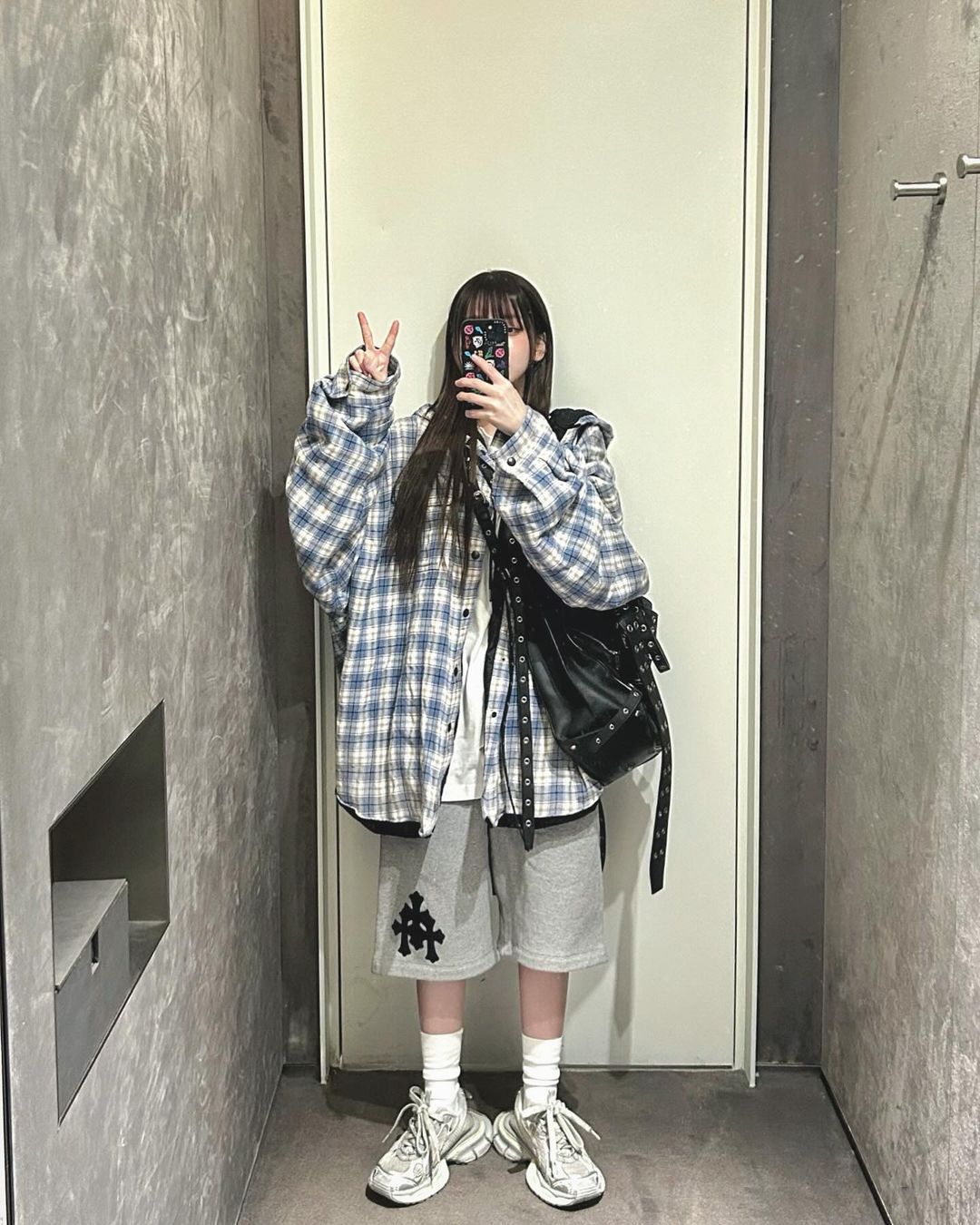 接下来这身同样让人看上去很舒服,各种穿搭氛围切换自如,脚上穿了双 Louis Vuitton。