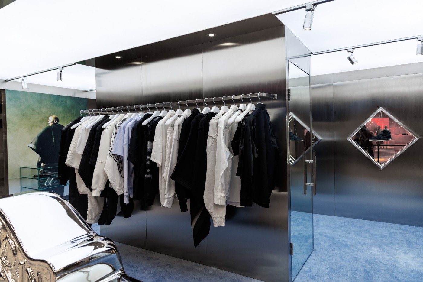 店内不仅陈列了最新的 Wings 潮奢系列鞋服产品,还打造了巨大的金属飞翼 Logo,冰冷又酷炫的高级质感让人过目不忘。