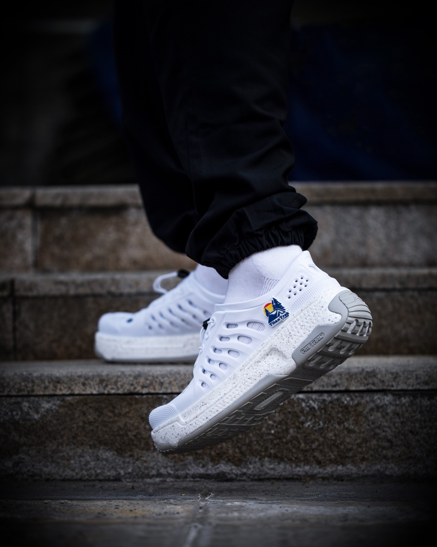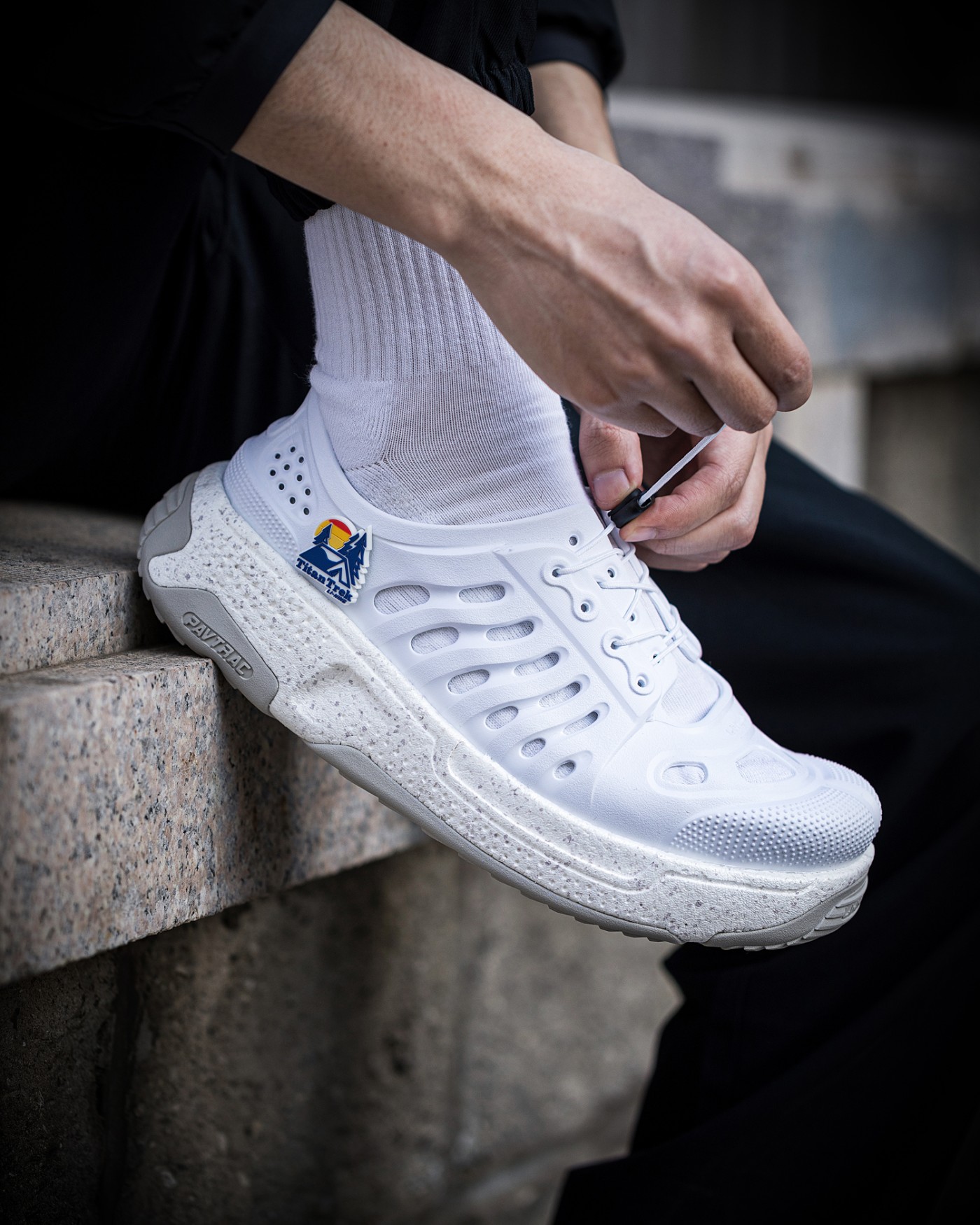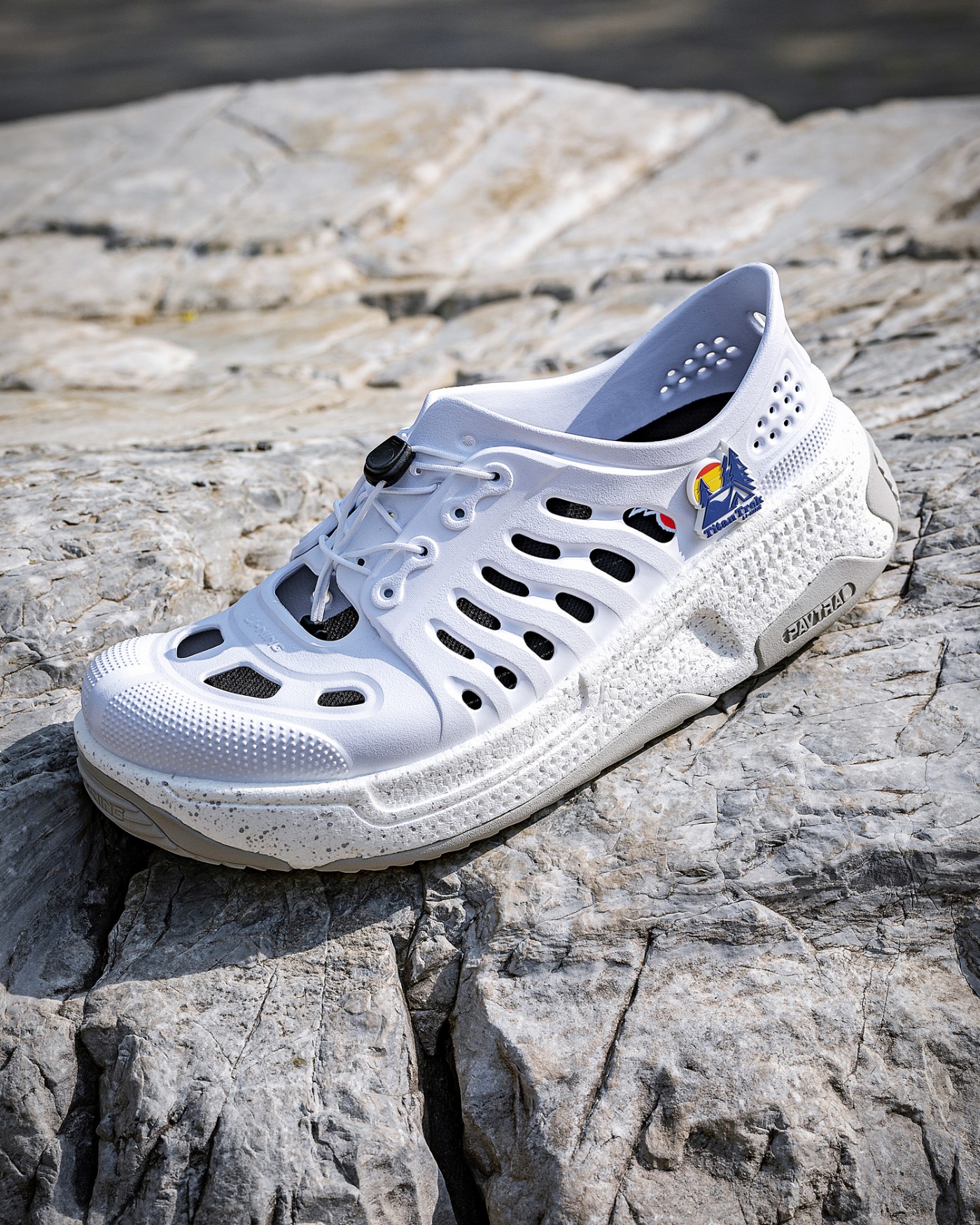 鞋身四周硕大的镂空开孔、厚实的鞋底保证优异的越野性能,白色这双鞋头一抹渐变亮色点缀,更是相当抓人眼球。