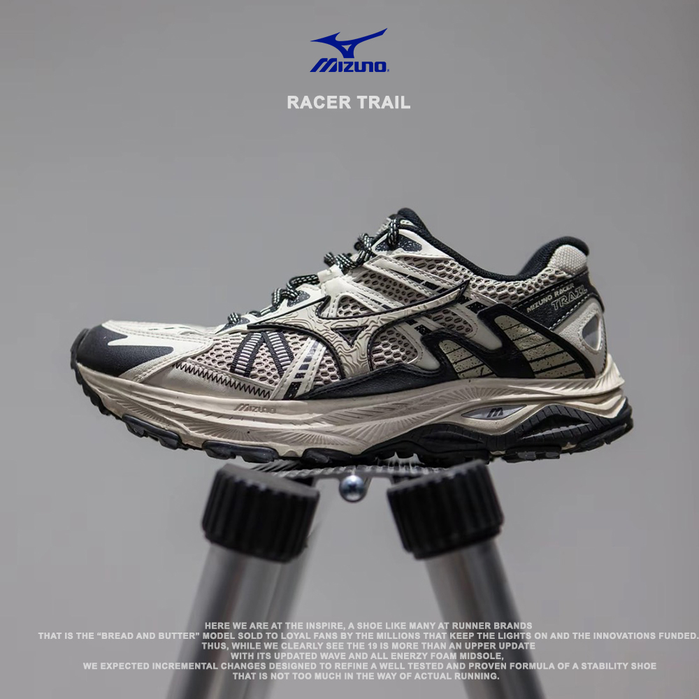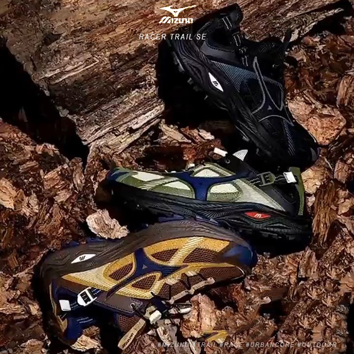 由 Mizuno Racer Trail 复古跑鞋演变而来,换用了抽绳式鞋带,后跟部分通过绑带系统进行简化。