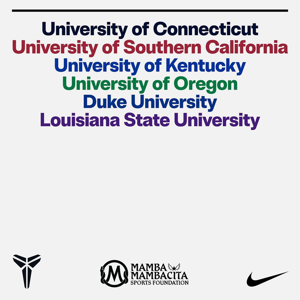 去年,伴随着 Nike Kobe 战靴复刻重启,瓦妮莎也官宣了一批由 Kobe 系列赞助的 NCAA 篮球校队。