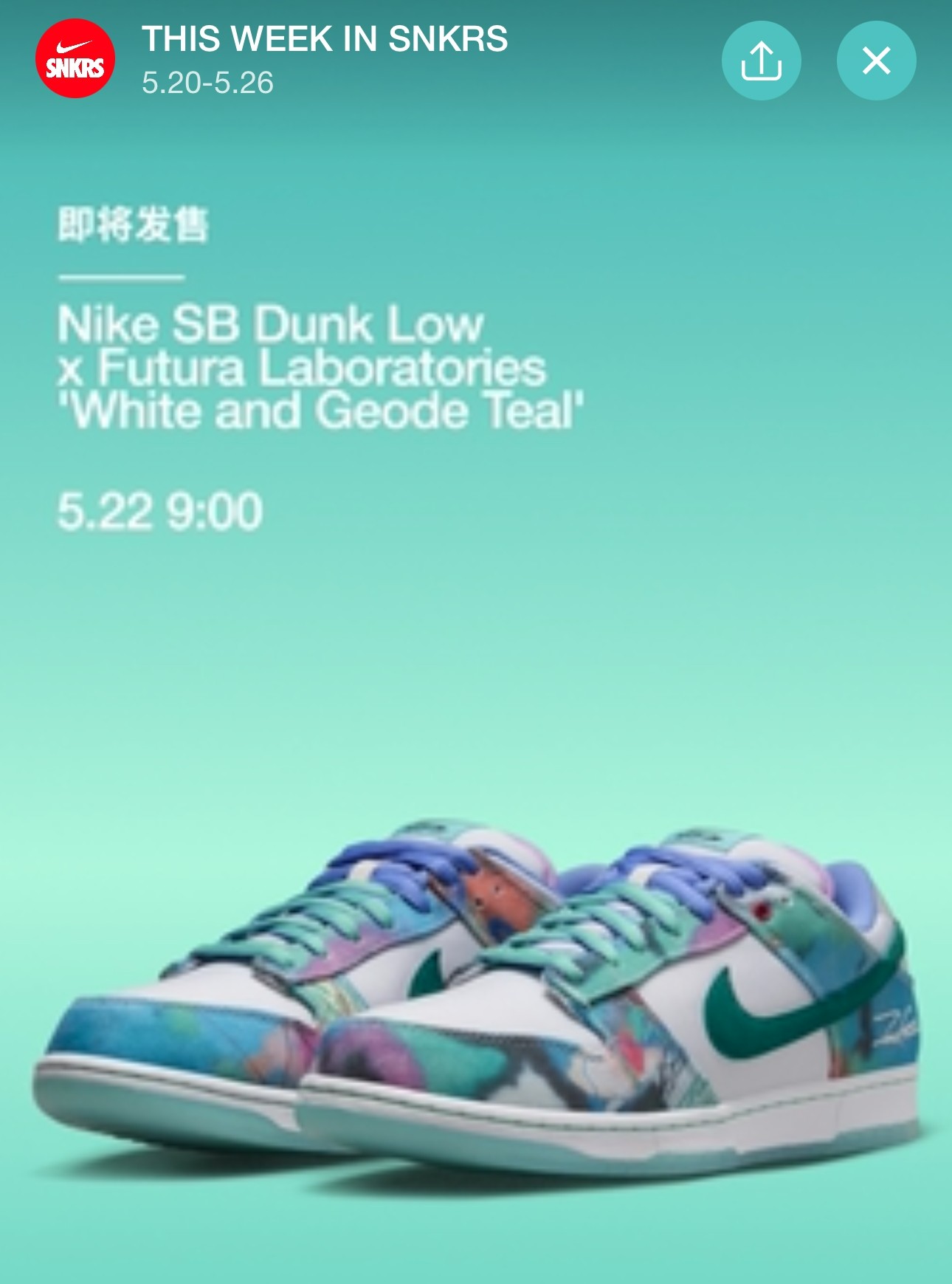 目前国区也正式预告了 Futura Laboratories x Nike SB Dunk Low 的登场,同样是 5 月 22 日这周三。