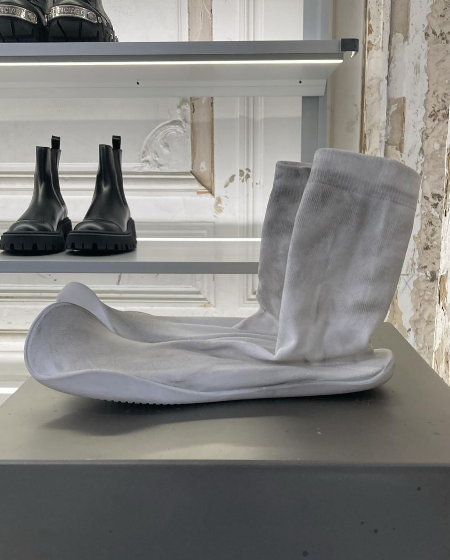 值得注意的是,侃爷为了配合一身纯白的 CleanFit 穿搭,上脚了一双最新的巴黎世家「袜子鞋」。