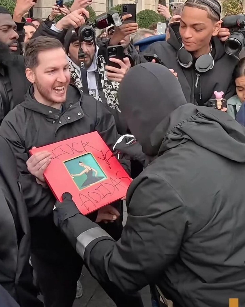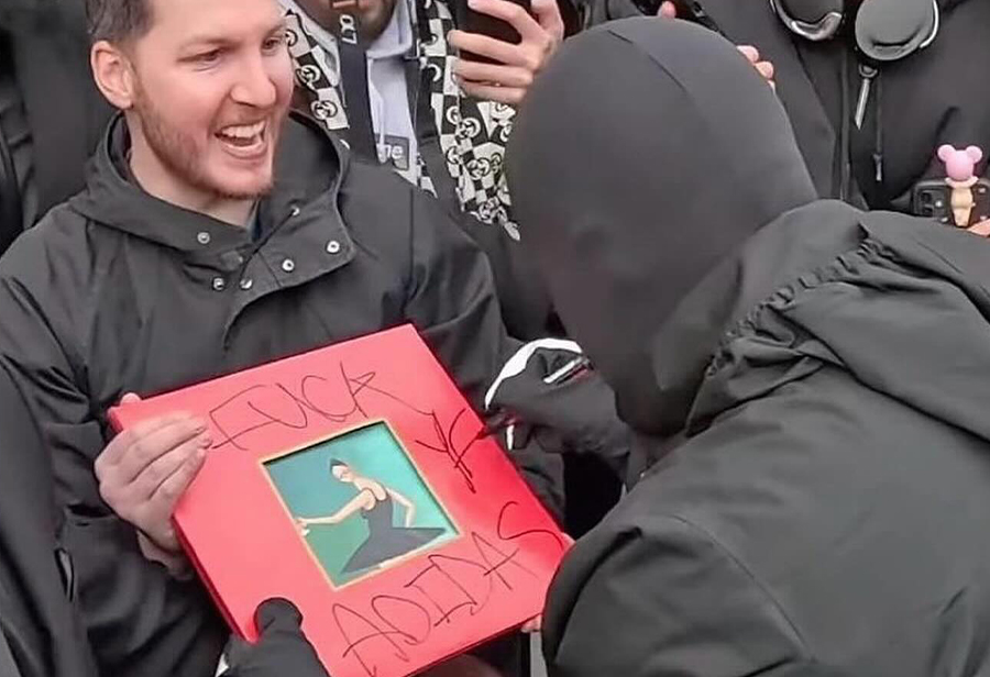 一位粉丝拿着一张唱片寻求侃爷的签名,侃爷二话不说直接大笔一挥,潇洒写下:“Fxxk adidas”,被周围诸多镜头捕捉了下来。